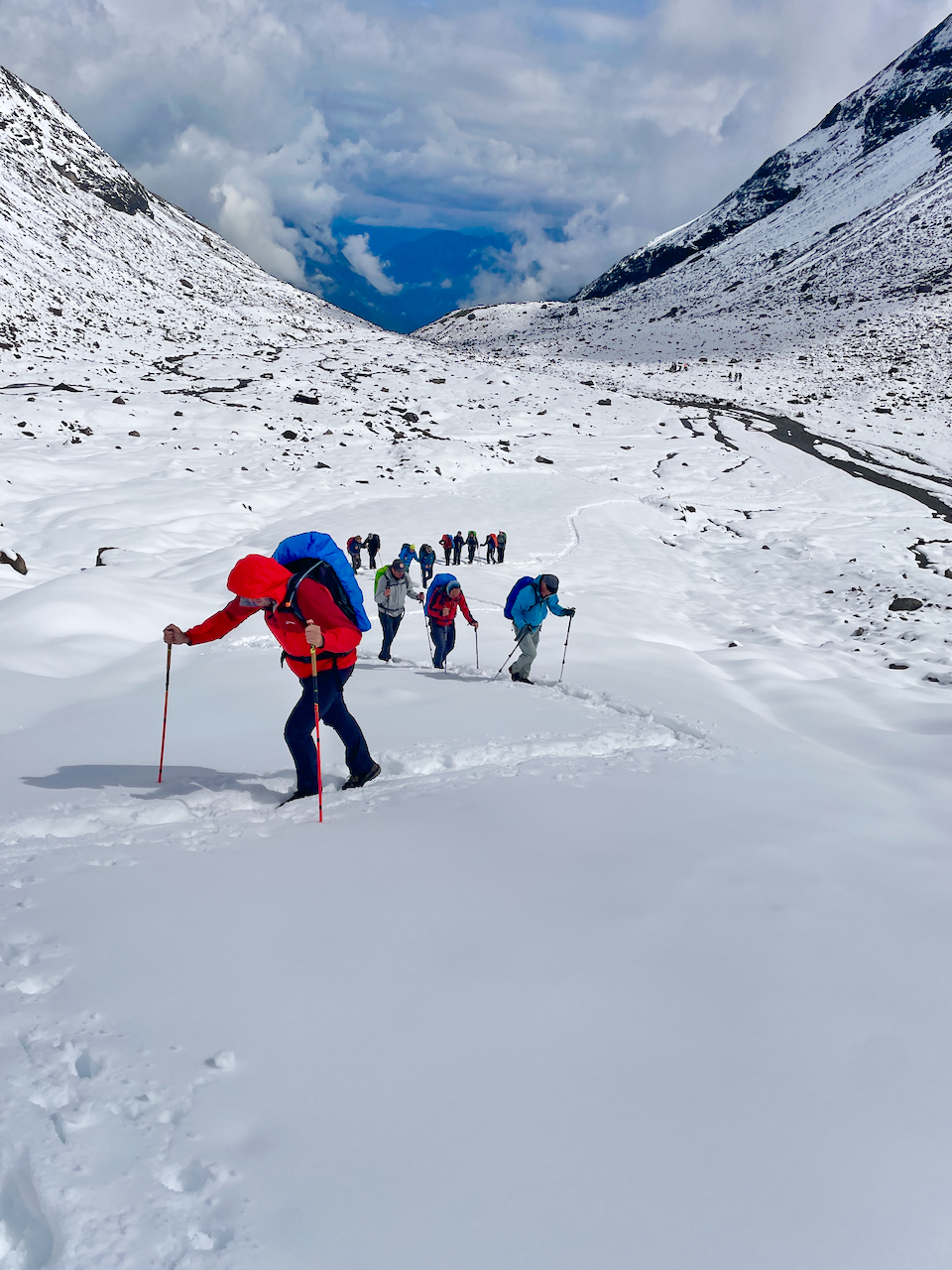 Oberhalb von 2.100 Metern wird es ernst. Der Schnee wird tiefer, der Wind stärker. Die Spur füllt sich wieder, kaum dass man sie gelegt hat.