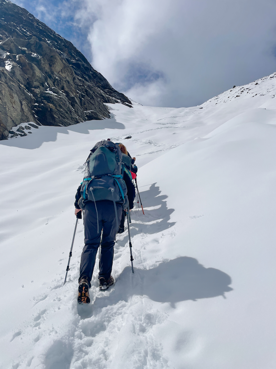 Der Übergang an der Pfandlscharte auf 2.663 Metern ist der höchste Punkt unserer Alpenüberquerung. Der Aufstieg zieht sich in Serpentinen durch tiefen Schnee. Schritt für Schritt, ruhig, ohne große Worte.