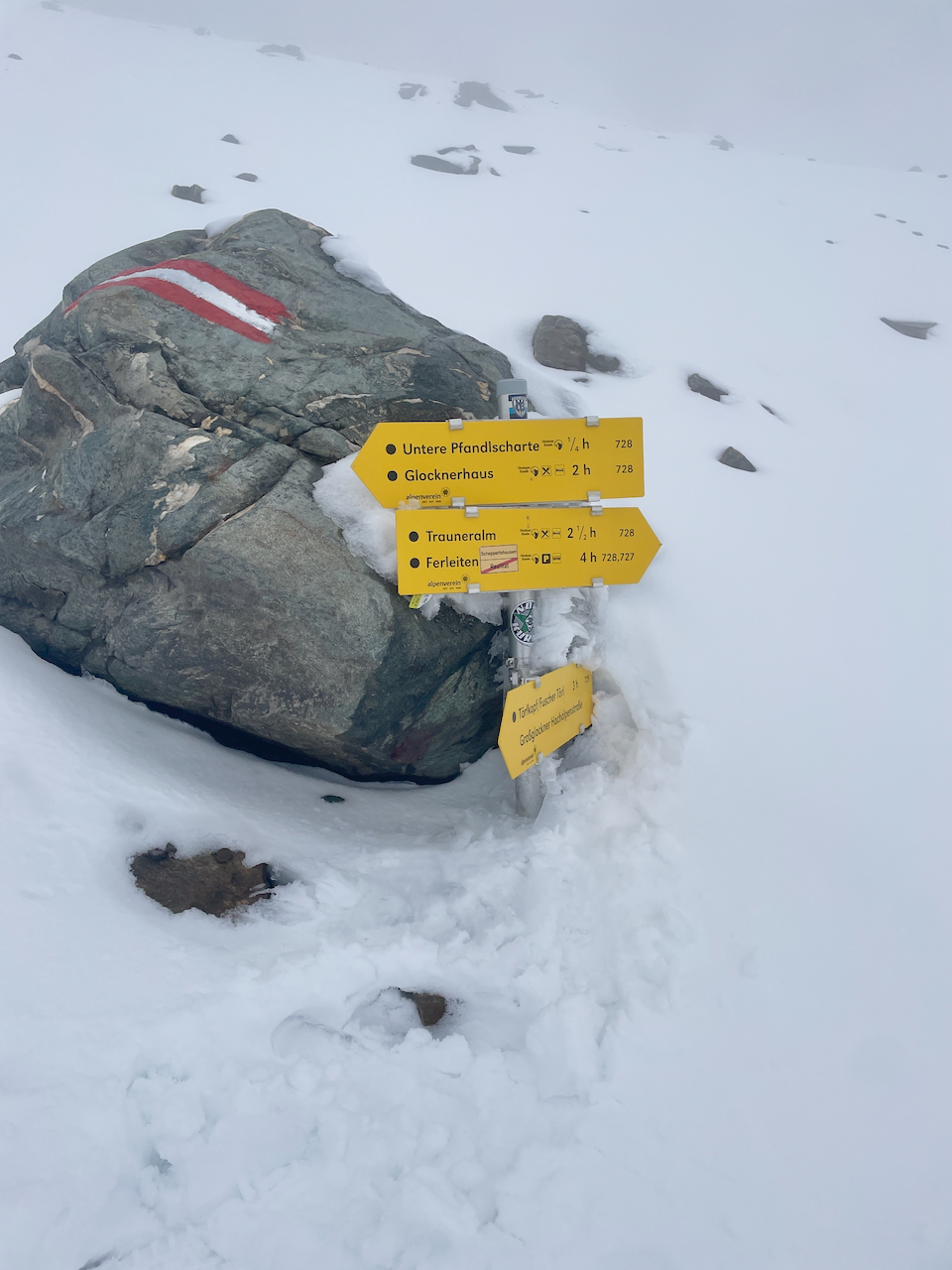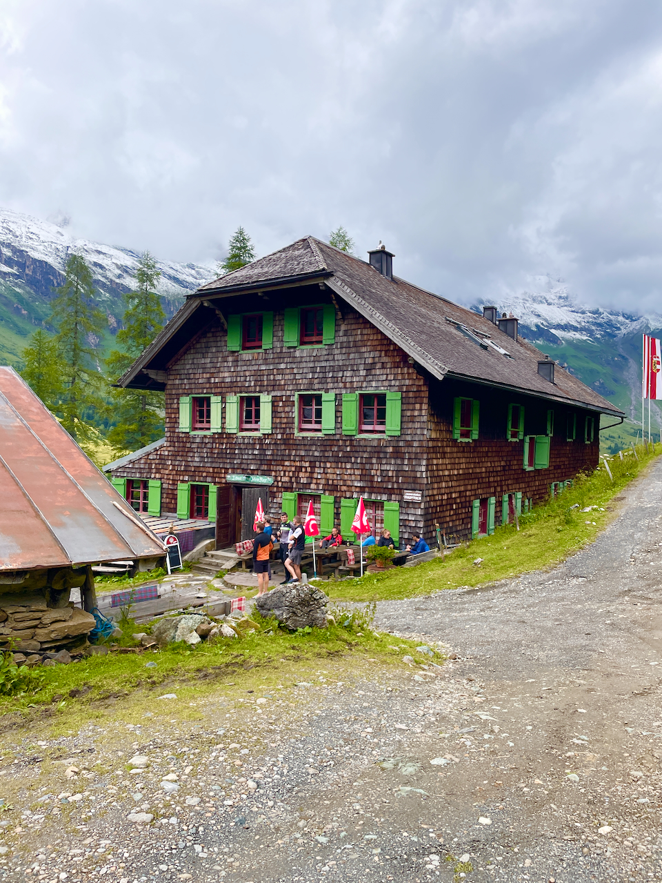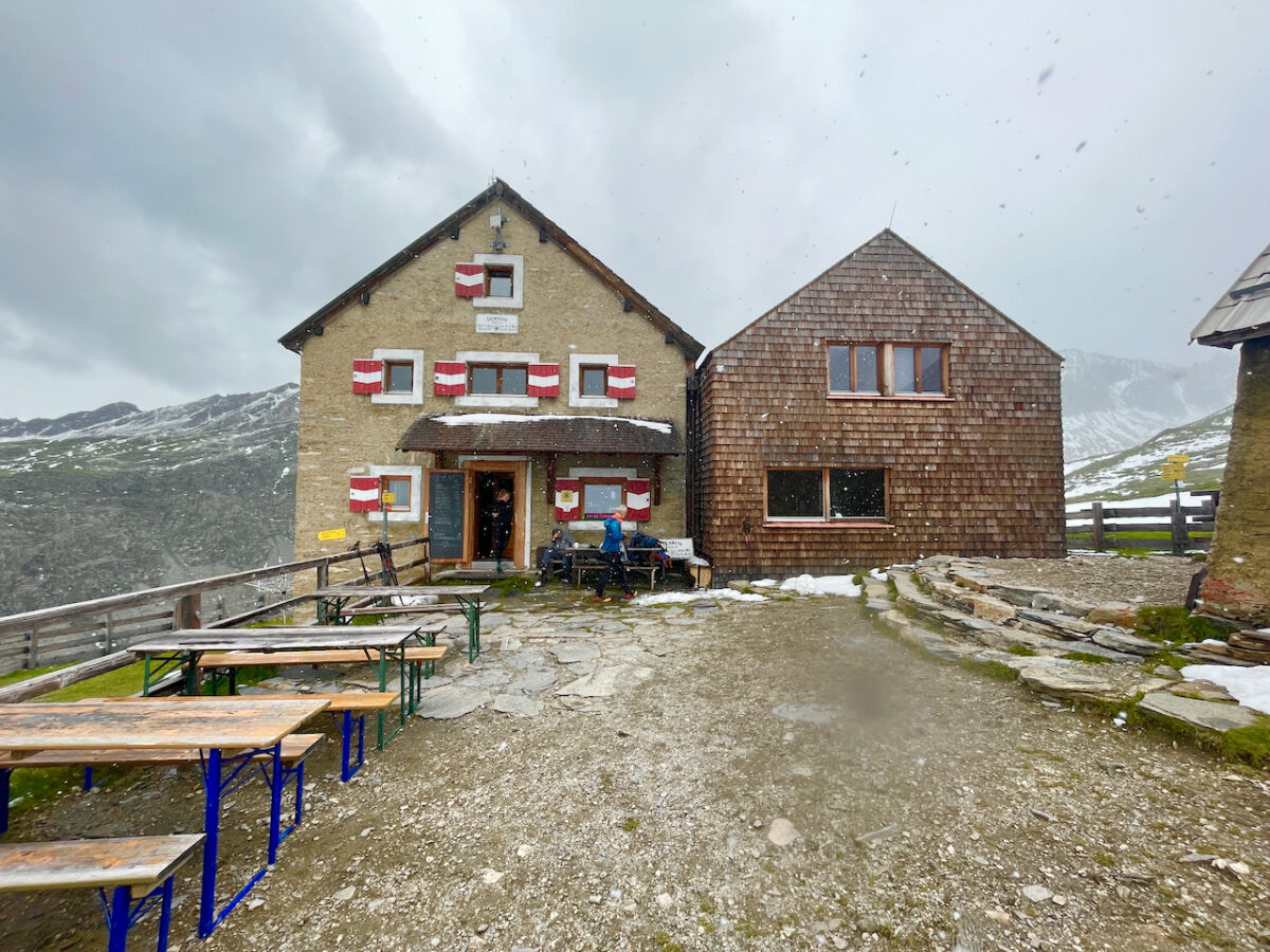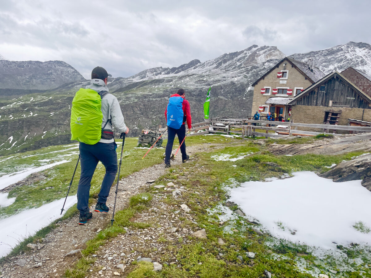 Während wir in der Salmhütte einkehren, scheint draußen kurz die Sonne. Kaum wieder draußen, mischen sich wieder Schnee und Graupel unter den Regen. Es passt ins Bild dieser Woche. Die letzten Meter zur Glorer Hütte ziehen sich wie immer am Ende einer Tour.