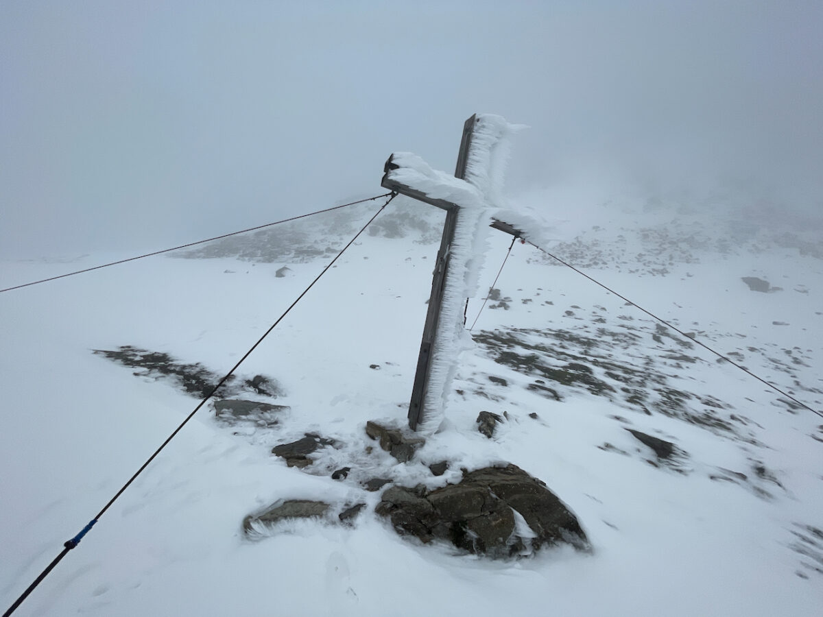 Am anberaumten „Gipfelkreuz“ bleiben wir nicht lange. Wind und Kälte treiben uns weiter. Ein Abstecher auf den Spielmann (und somit den einzigen 3.000er der Tour) sparen wir uns heute mangels Aussicht.