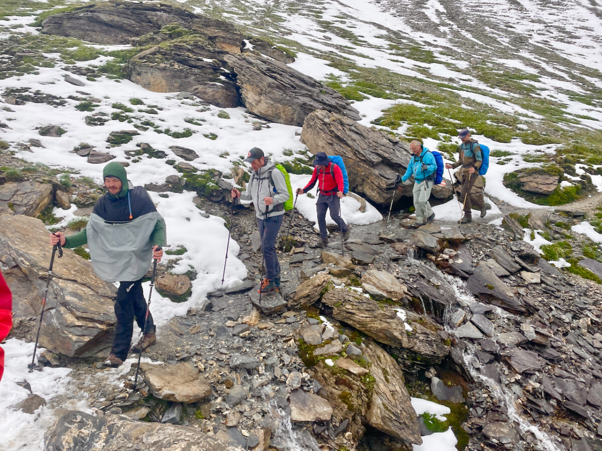 Am sechsten Tag stehen noch der Anstieg zur Stockerscharte und die Querung Richtung Salmhütte an. Die Bewegungen sitzen inzwischen, jeder weiß, wie der andere geht. Zu sehen gibt es im Nieselregen nur wegen. Die Pausen halten sich in Grenzen, lange rumstehem will bei Temperaturen um die 10 Grad keiner.