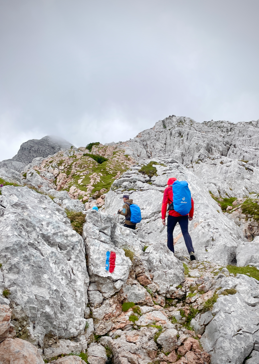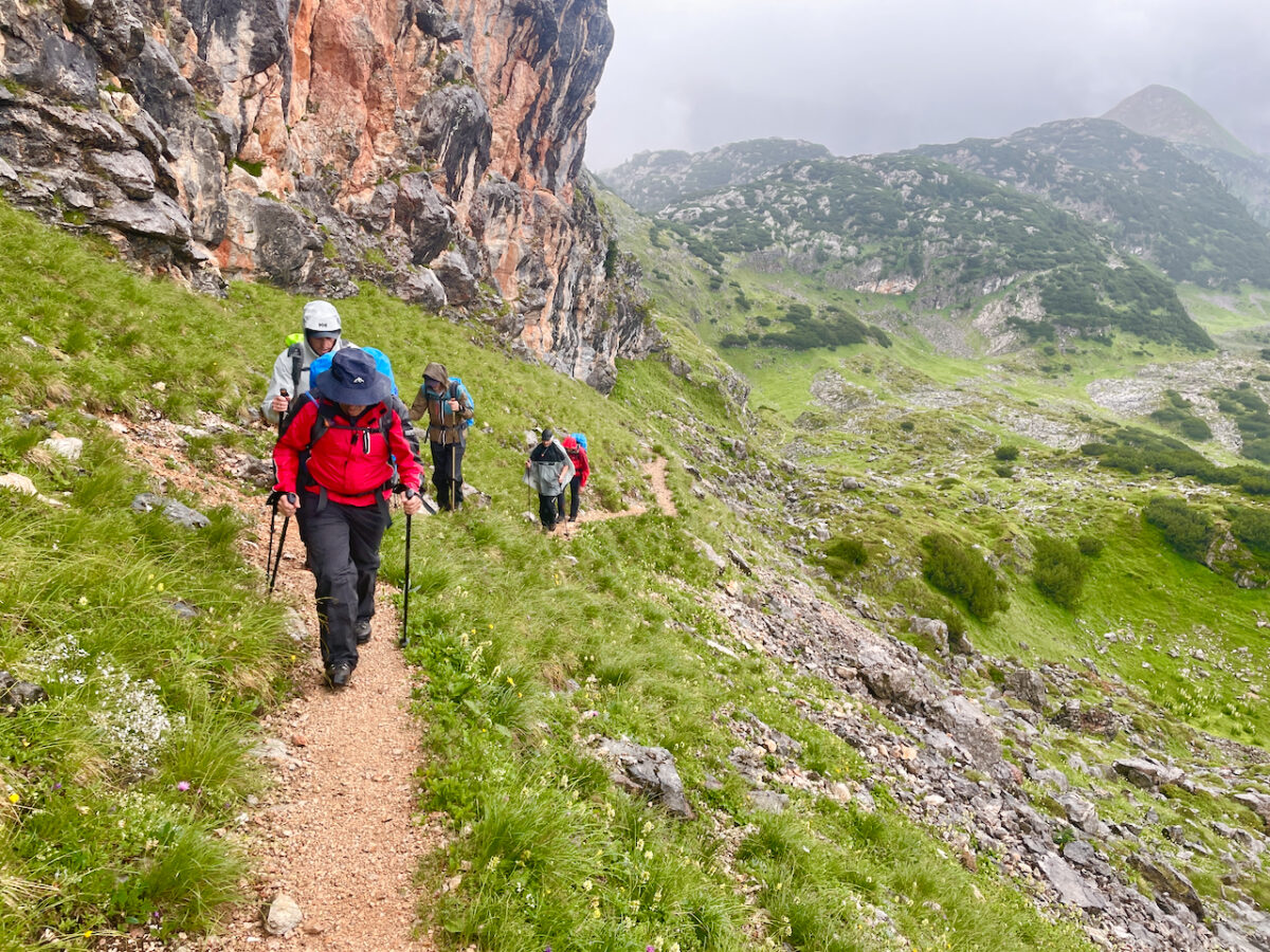 Wer das Gebiet kennt, weiß, was das bedeutet: weite Karstflächen, zerfurchte Platten, Dolinen, dazwischen Markierungen, die man im Nebel auch mal suchen muss. Technisch ist der Weg gut angelegt, aber das Gelände bleibt anspruchsvoll. Orientierungssinn ist gefragt, besonders wenn die Sicht eingeschränkt ist.