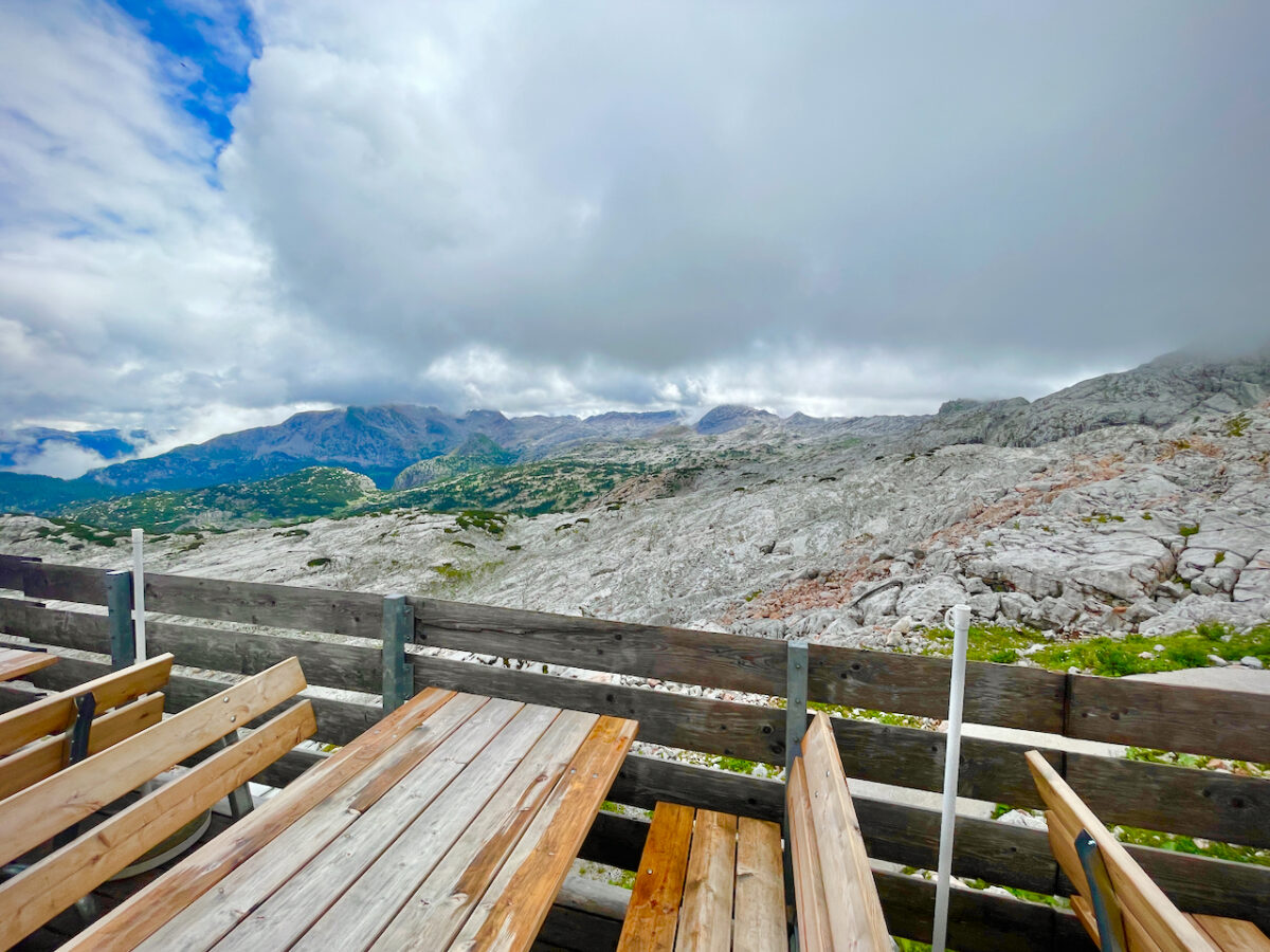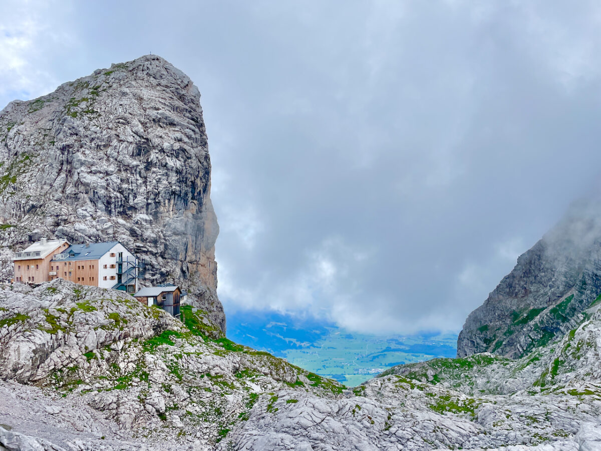 Wir steigen Richtung Ingolstädter Haus auf und gehen nach einer kurzen Mittagspause in der warmen Gaststube weiter zum frisch renovierten Riemannhaus. Zwischen Regenschauern reißt es immer wieder kurz auf. Dann sieht man, wie weit sich dieses Plateau tatsächlich zieht. Karg, steinig, eigenwillig. Vom Hundstod hinter uns bis hinüber zum Hochkönig, der zwischendurch durch die Wolken grüßt.