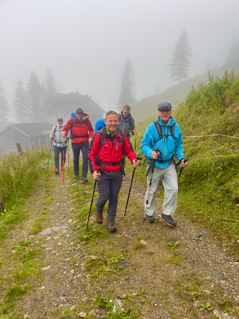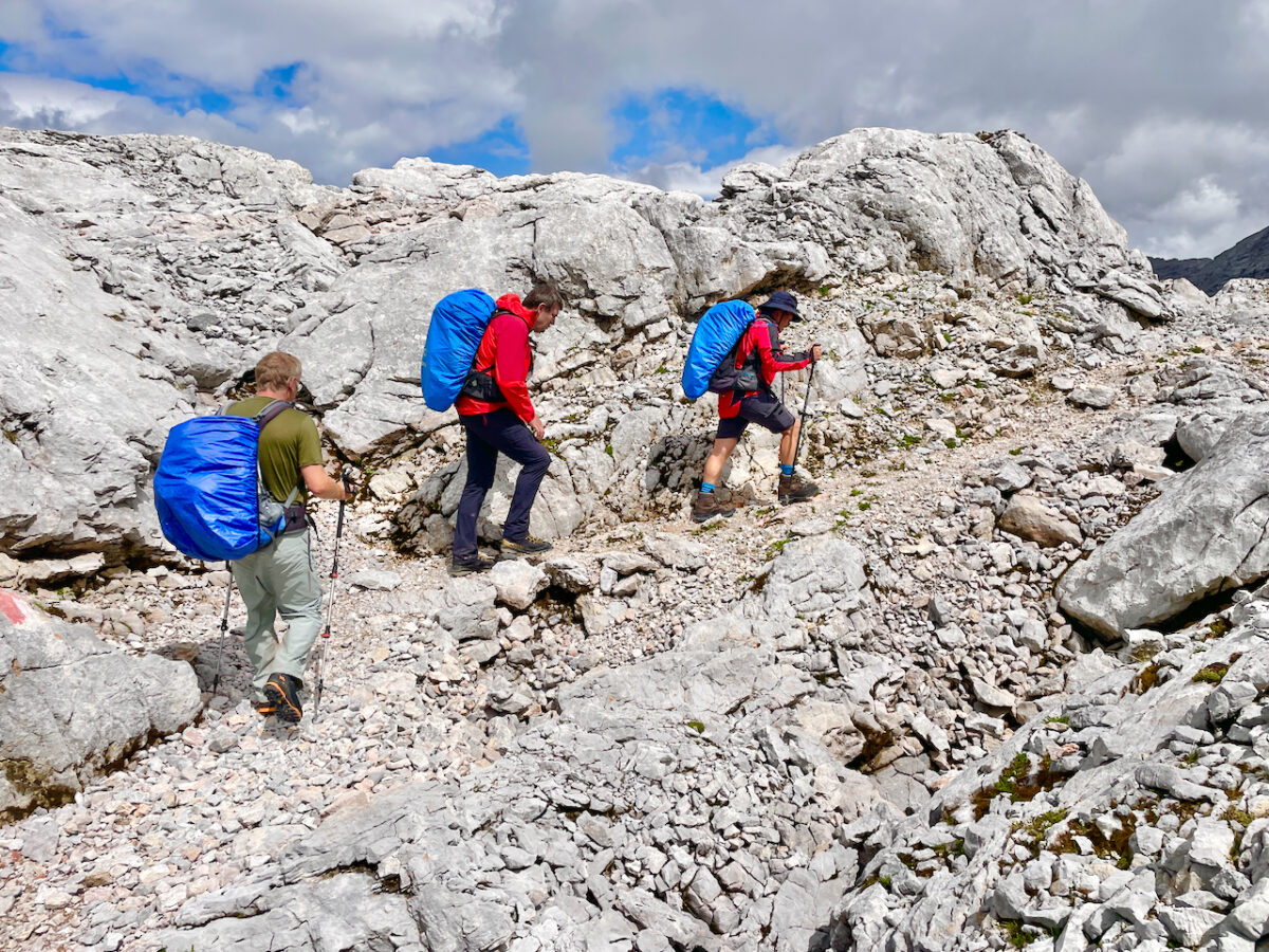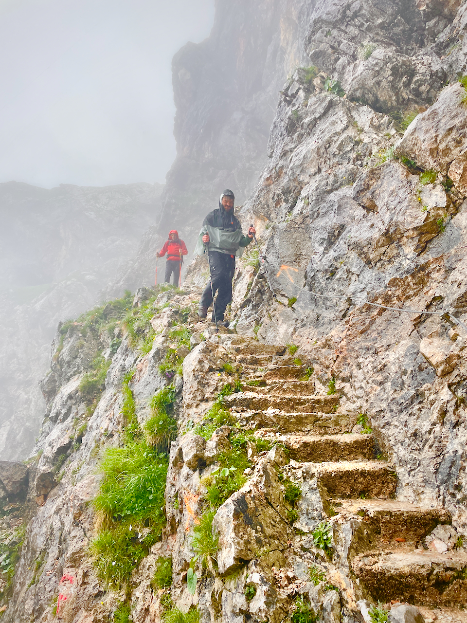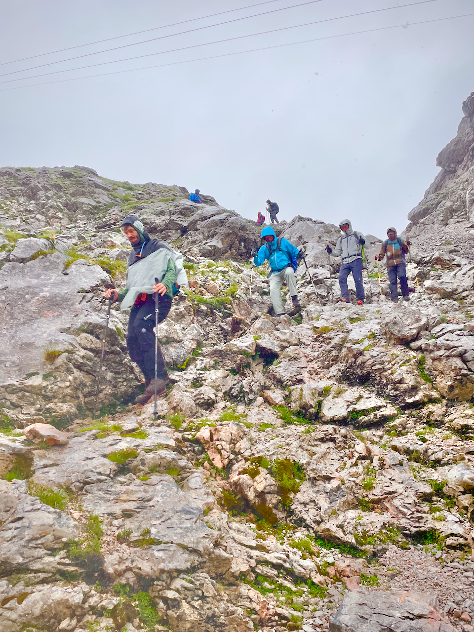Der dritte Tag beginnt wieder nass. Der Abstieg durch die Ramseiderscharte verlangt Aufmerksamkeit. Steile Passagen, teilweise ausgesetzt, dazu rutschiger Fels. Hier hilft kein Tempo, sondern sauberes Gehen – und natürlich das Stahlseil. Vor uns eine Familiengruppe in Ponchos, die den Abstieg angeseilt antritt. Wir überholen und hoffen, dass die Gruppe heil unten ankommt.