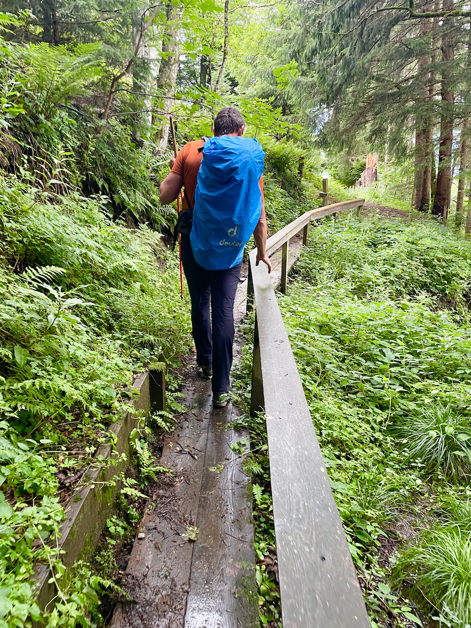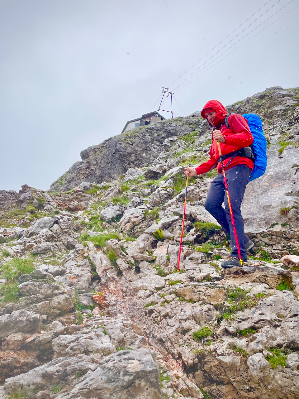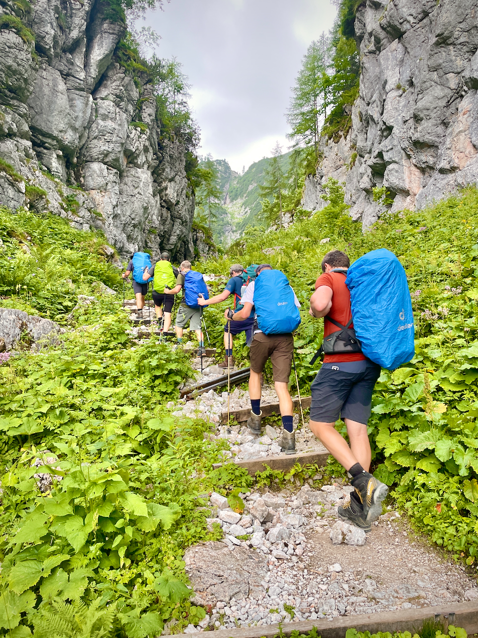 Der dritte Tag beginnt wieder nass. Der Abstieg durch die Ramseiderscharte verlangt Aufmerksamkeit. Steile Passagen, teilweise ausgesetzt, dazu rutschiger Fels. Hier hilft kein Tempo, sondern sauberes Gehen – und natürlich das Stahlseil. Vor uns eine Familiengruppe in Ponchos, die den Abstieg angeseilt antritt. Wir überholen und hoffen, dass die Gruppe heil unten ankommt.