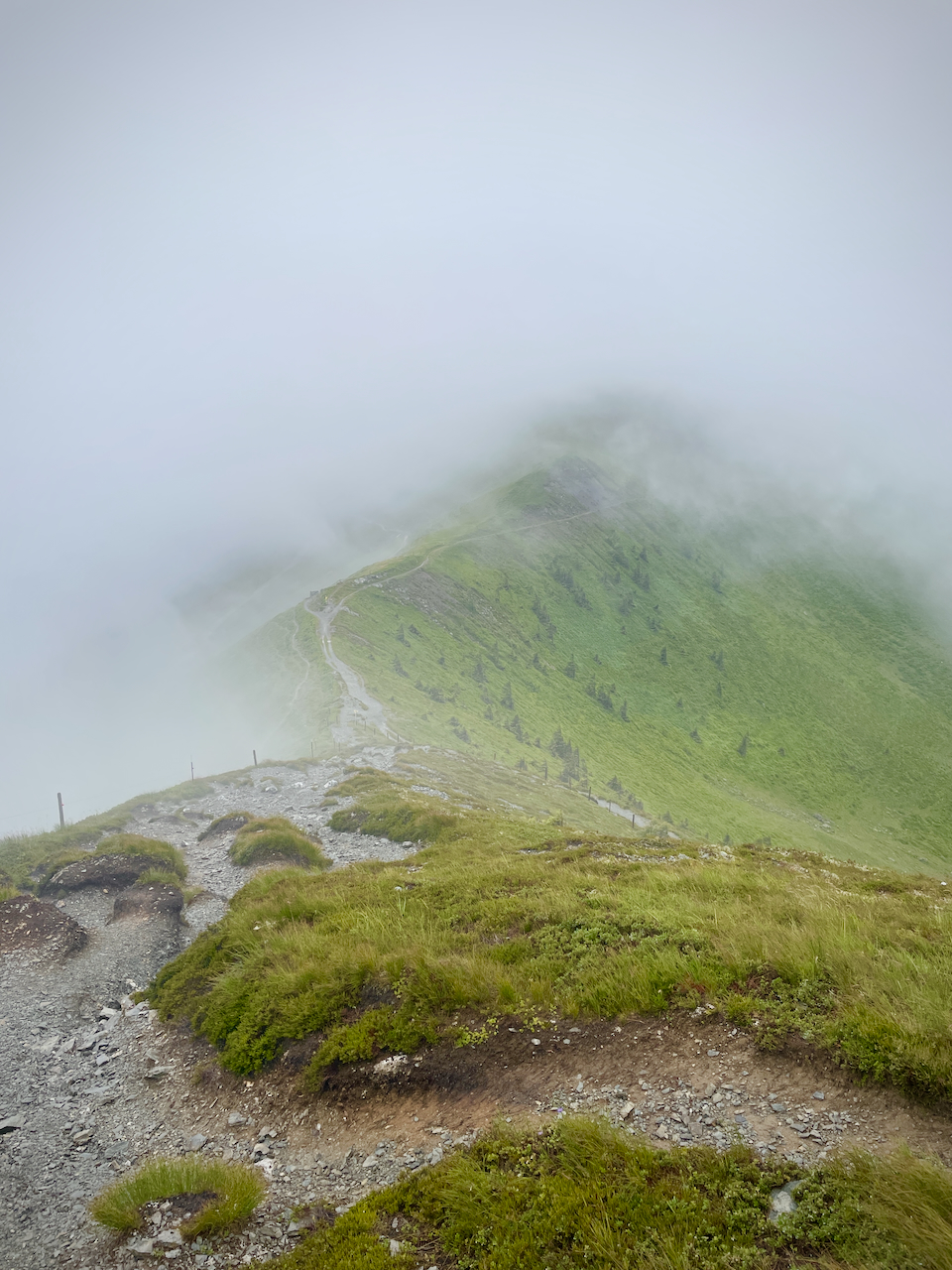 Das ändert sich spätestens an der Saugasse. Über 30 Kehren, rund 400 Höhenmeter am Stück. Ein Aufstieg, der die Gruppe sortiert und den Kreislauf in Schwung bringt. Das wichtigste: Ein stetes Tempo höhlt den Stein. Oben setzt der Regen ein. Erst Niesel, dann anhaltend. In den nächsten Tagen wird er uns auf Schritt und Tritt begleiten.