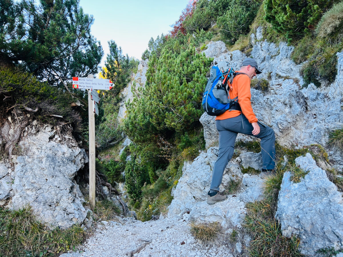 Für uns beginnt dagegen der schönste Abschnitt der Tour. Ein Stück folgen wir dem Dolomiten-Höhenweg 10. Die Route zieht sich über luftige Höhen zwischen dem Corno di Pichea und dem Monte Tofino.