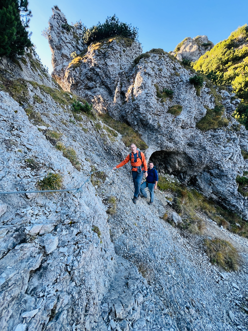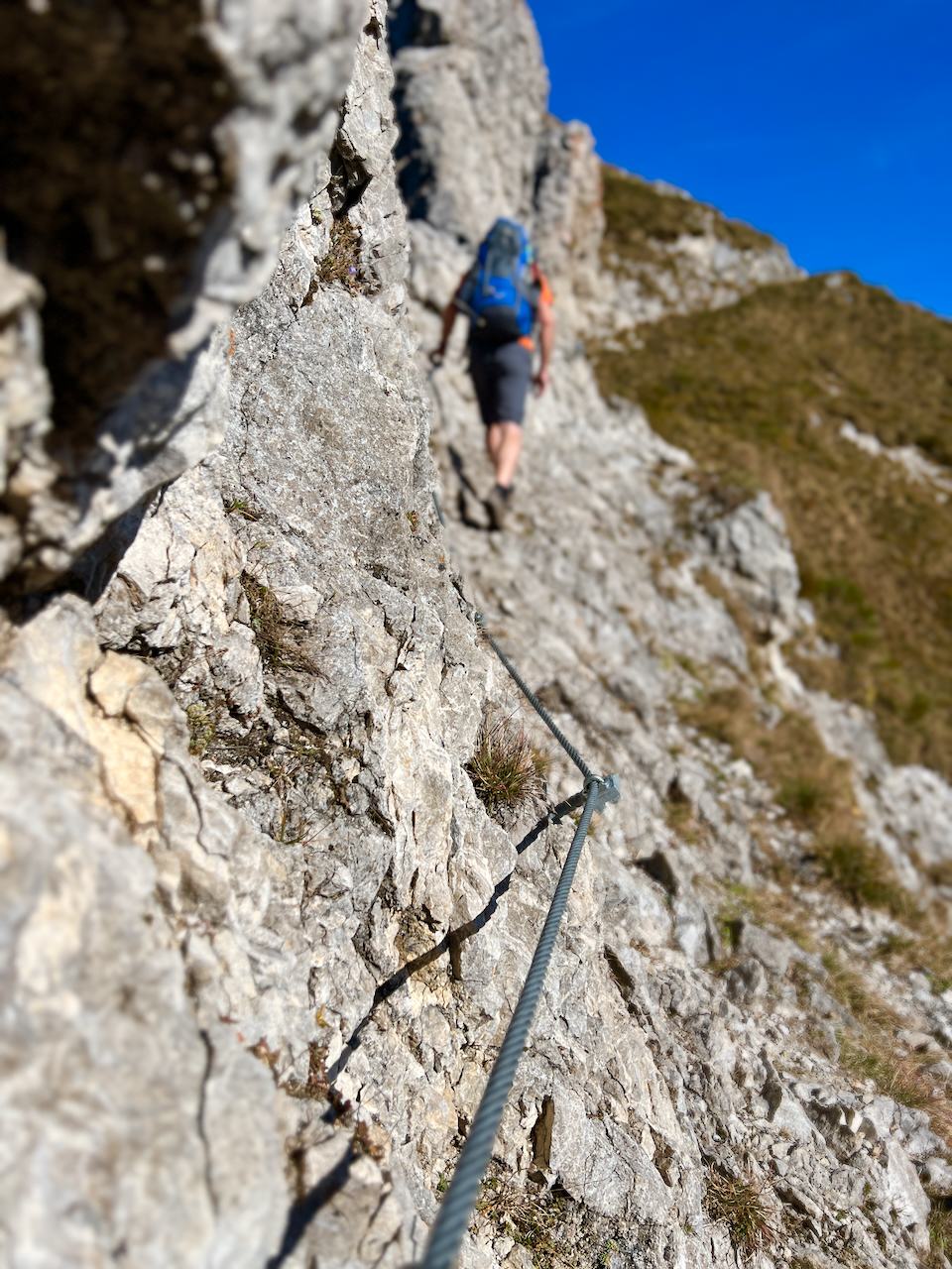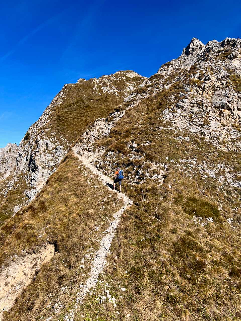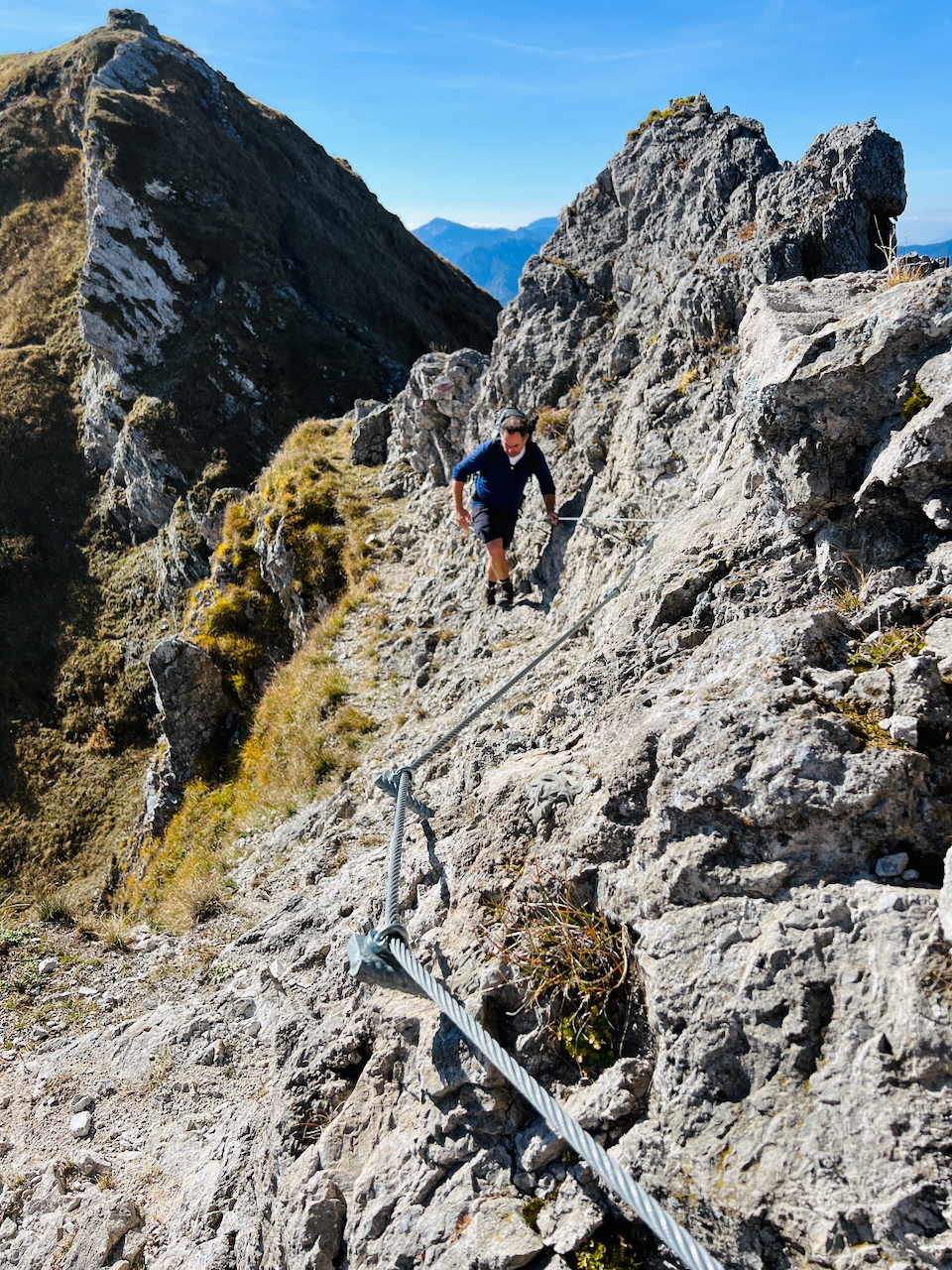Der Grat ist pures Wanderglück: felsige Passagen, kurze Kraxelstellen, gelegentlich ein Stahlseil zur Sicherung. Nicht zu schwer, nicht zu leicht – genau richtig, um den Blick immer wieder über die Landschaft schweifen zu lassen.
