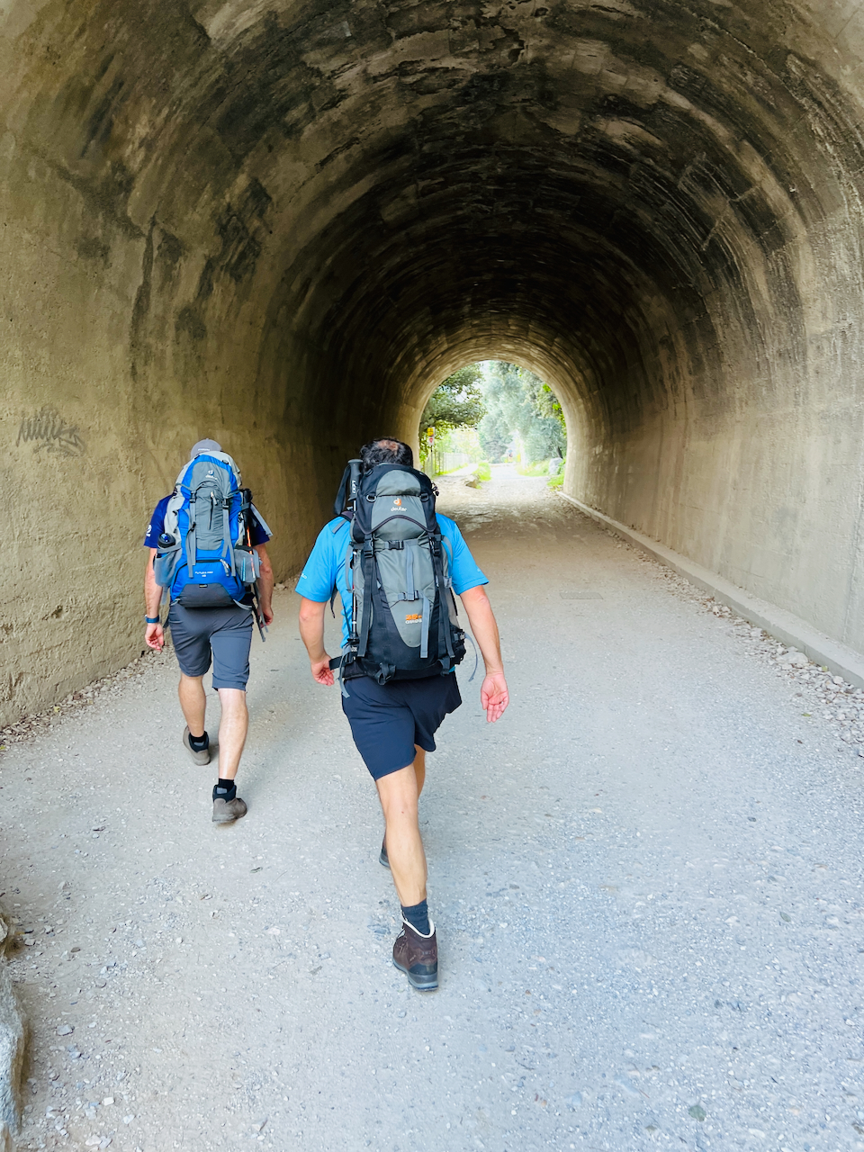 Zwischen dunklen Tunneln und ausgesetzten Passagen zieht sich die Trasse in Serpentinen nach oben. Während uns Mountainbiker und E-Bikes entgegenkommen, sind Wanderer selten. Vielleicht, weil viele den spektakulären Weg längst den Rädern überlassen haben. Für uns bedeutet das vor allem eines: Zeit für die Aussicht.