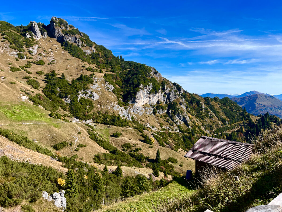 Nach dem Höhenweg folgt der lange Abstieg: Über die Almflächen der Malga Nardis verlieren wir fast 1700 Höhenmeter. Vier Stunden lang ziehen sich die Pfade durch Schrofengelände, Wiesen und Kastanienwälder.