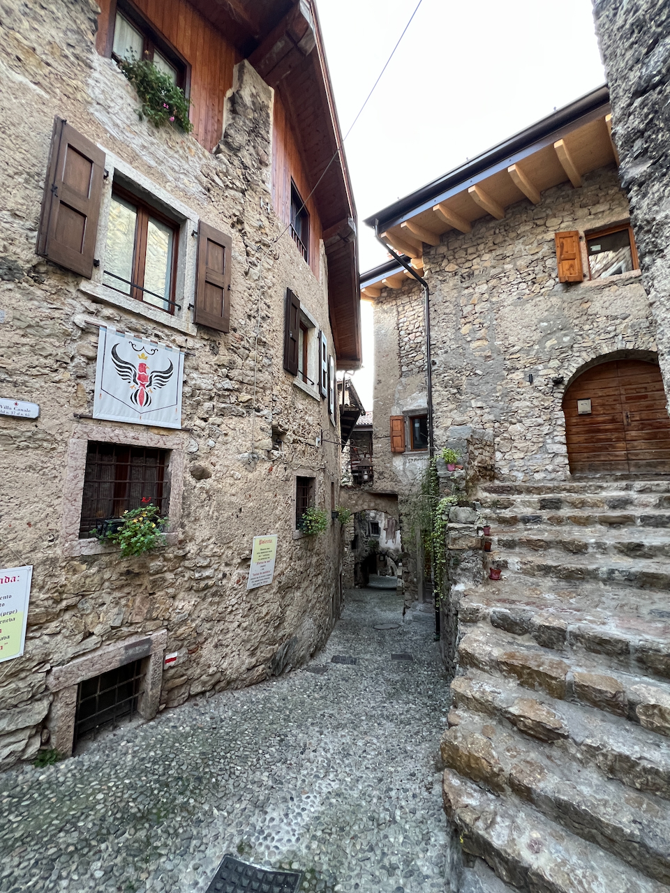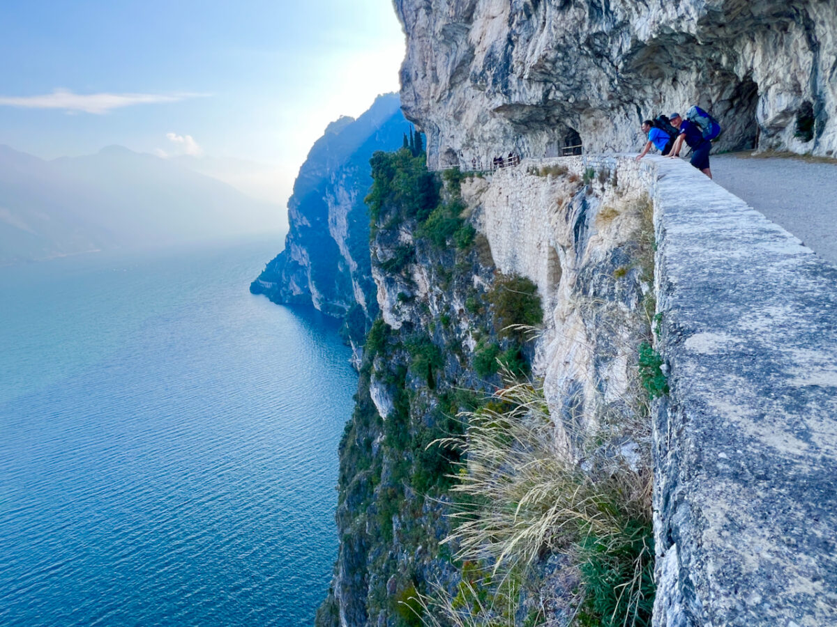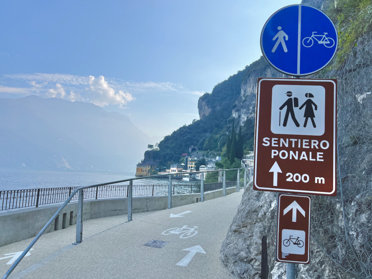 Der Weg aus der Stadt folgt der legendären Ponalestraße. Die alte Militär- und Handelsstraße wurde im 19. Jahrhundert spektakulär in die Felswand gesprengt, um den See mit dem Ledrotal zu verbinden. Heute gehört sie zu den schönsten Panoramawegen am nördlichen Gardasee.