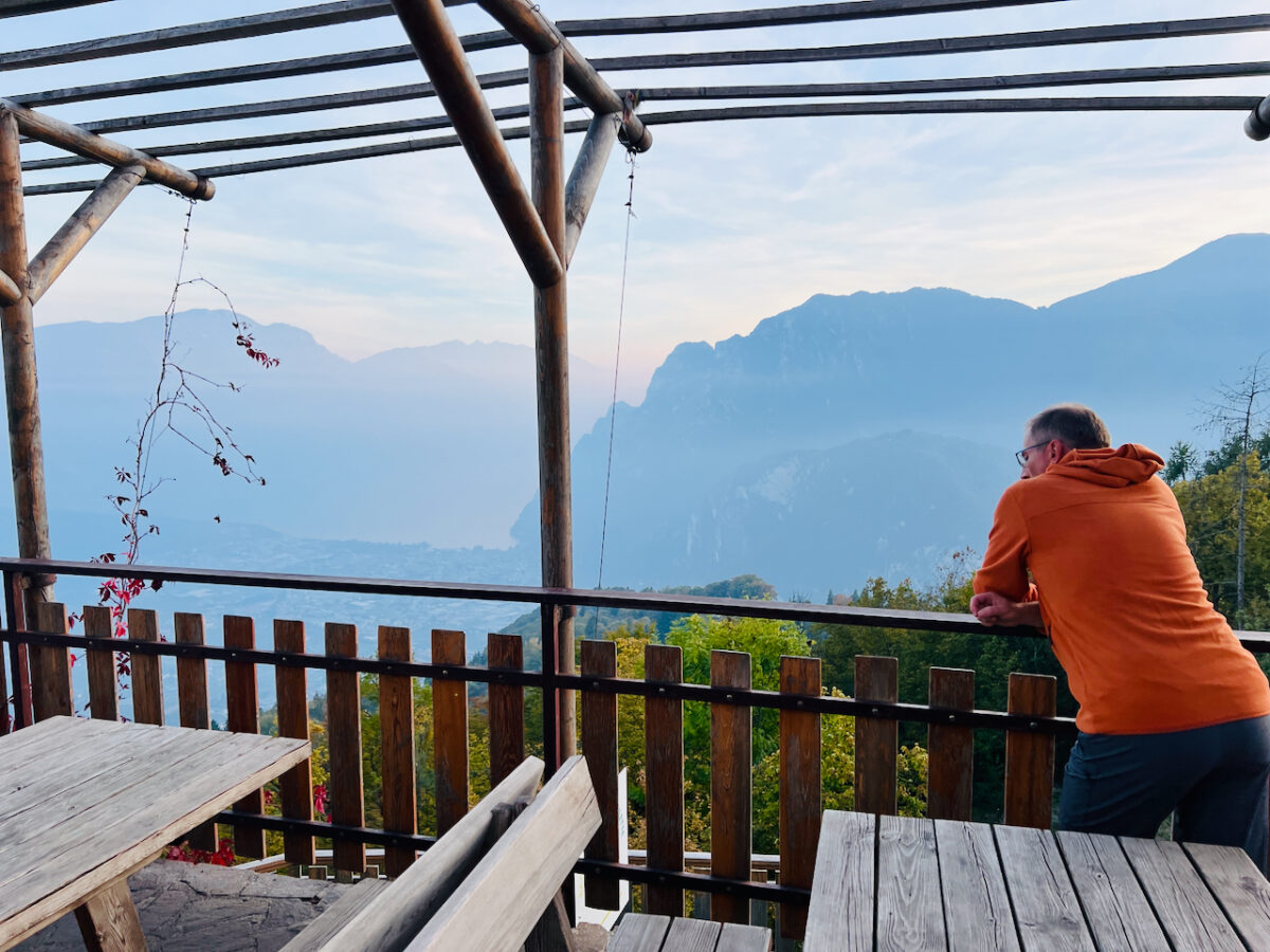 Unter uns liegen Arco und Riva del Garda, dahinter glitzert der See im Abendlicht. Wir sitzen auf der Terrasse, vor uns trentiner Spezialitäten und ein Glas Rotwein. Hinter uns die Berge und eine kleine Kapelle, unter uns der Lago. Ein besserer Ort für das letzte Abendessen dieser Tour ist kaum vorstellbar.