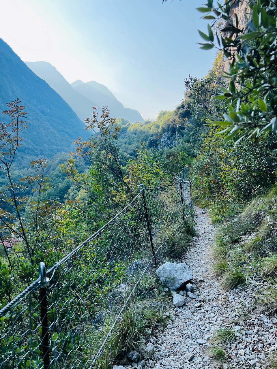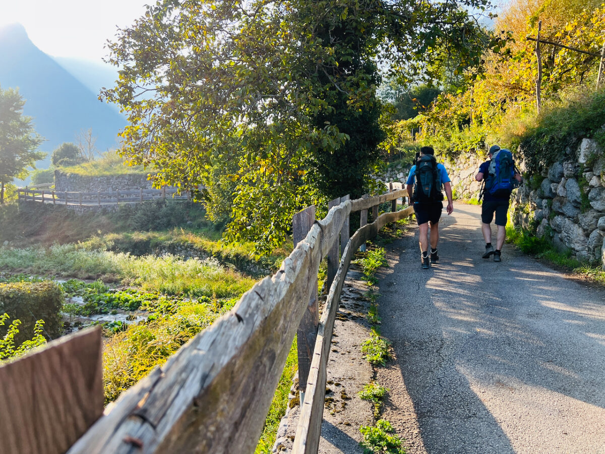 Vier Kilometer und vierhundert Höhenmeter trennen uns noch vom Abendessen. Der Weg führt steil durch Kastanienwälder hinauf – doch oben wartet einer der schönsten Aussichtspunkte am nördlichen Gardasee.