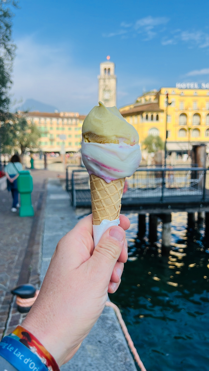 Stilecht beginnt unsere Tour mit einer Pause. In Riva del Garda sitzen wir mit Pizza und Prosecco am Tisch und lassen den Blick über den See schweifen. Man wird schließlich nicht jedes Jahr am Gardasee älter.