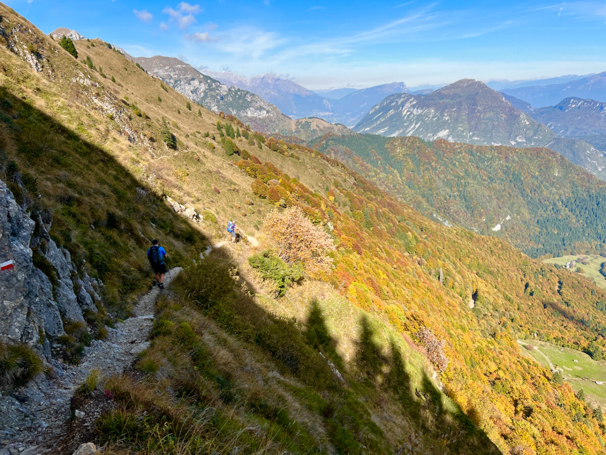 Zwischen der Cima d’Oro und der Cima Pari zieht sich das einsame Val di Dromaè steil nach oben. Schritt für Schritt steigen wir durch Wald und Almgelände, bis der Weg schließlich den Grat erreicht.