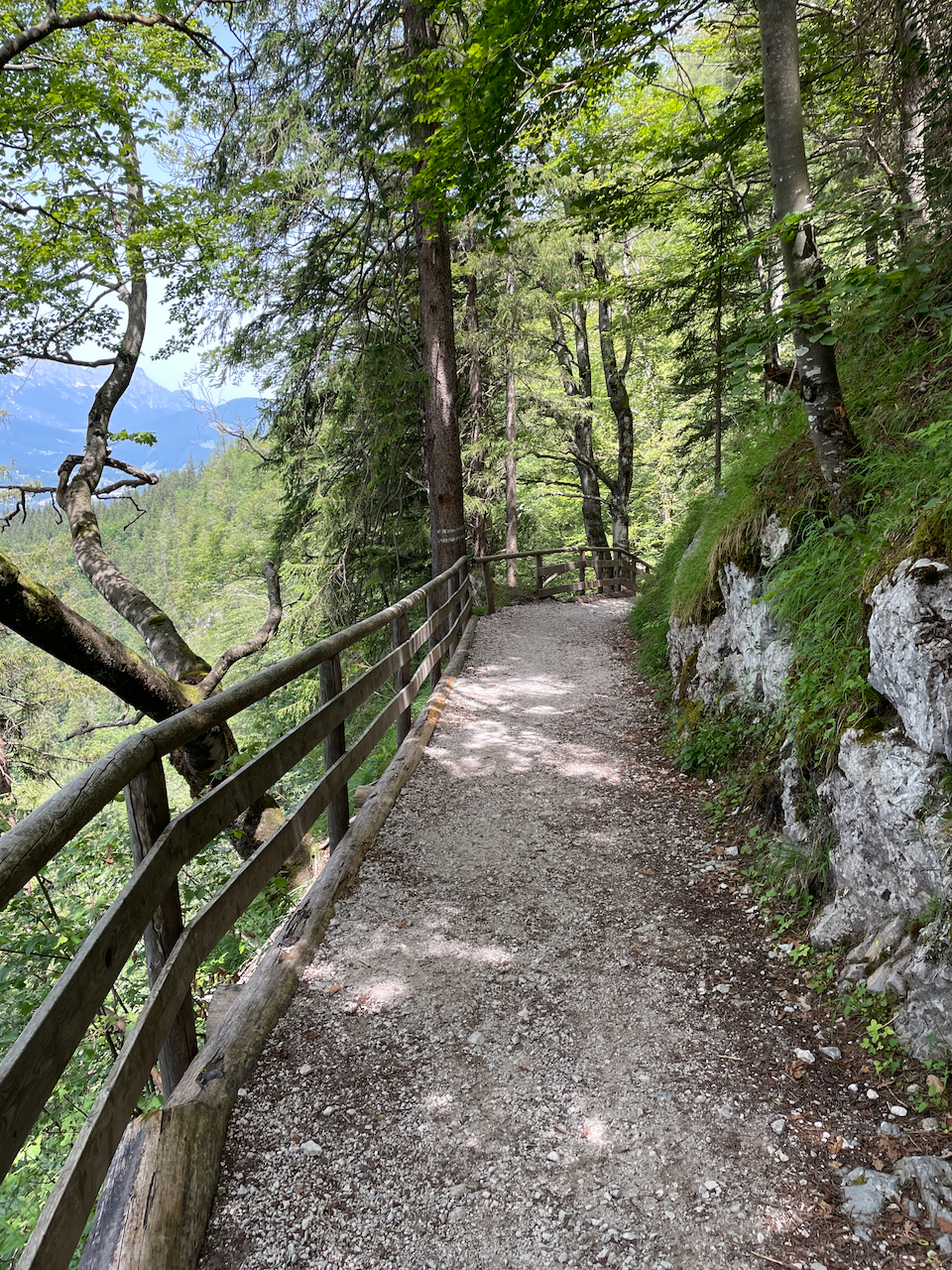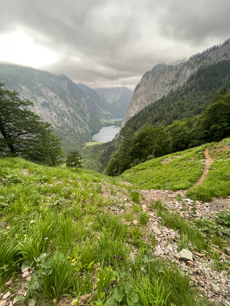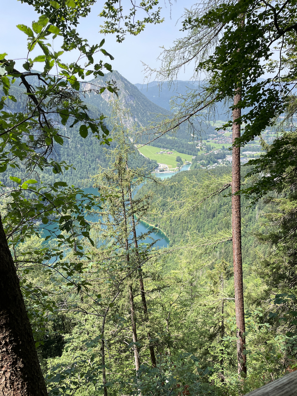 Der Weg zieht sofort steil an. Schon nach wenigen Minuten läuft der Schweiß. Bald jedoch taucht der Pfad in den schattigen Bergwald ein und windet sich über den Hochbahnweg zur Königsbachalm hinauf. Zwischen den Bäumen blitzt immer wieder der Königssee hervor – dunkelblau, tief eingeschnitten zwischen steilen Felsflanken. Von oben wirkt er tatsächlich wie ein Fjord.