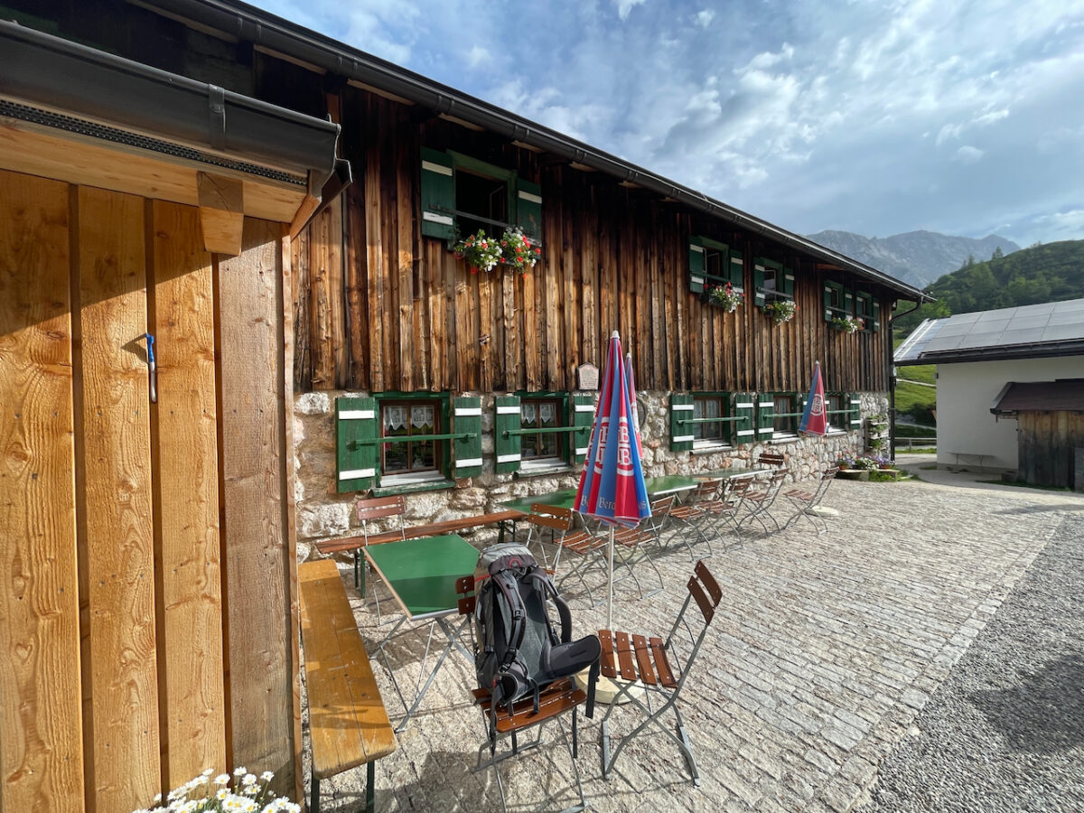 Links der Hohe Göll, rechts der Schneibstein – und gegenüber der Watzmann, der hier über allem zu wachen scheint. Ein Abendessen, ein kühles Bier, und langsam stellt sich das Gefühl ein, unterwegs und gleichzeitig angekommen zu sein.