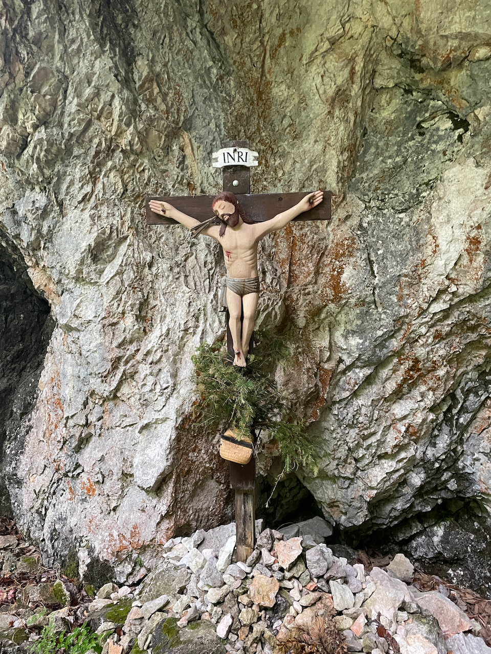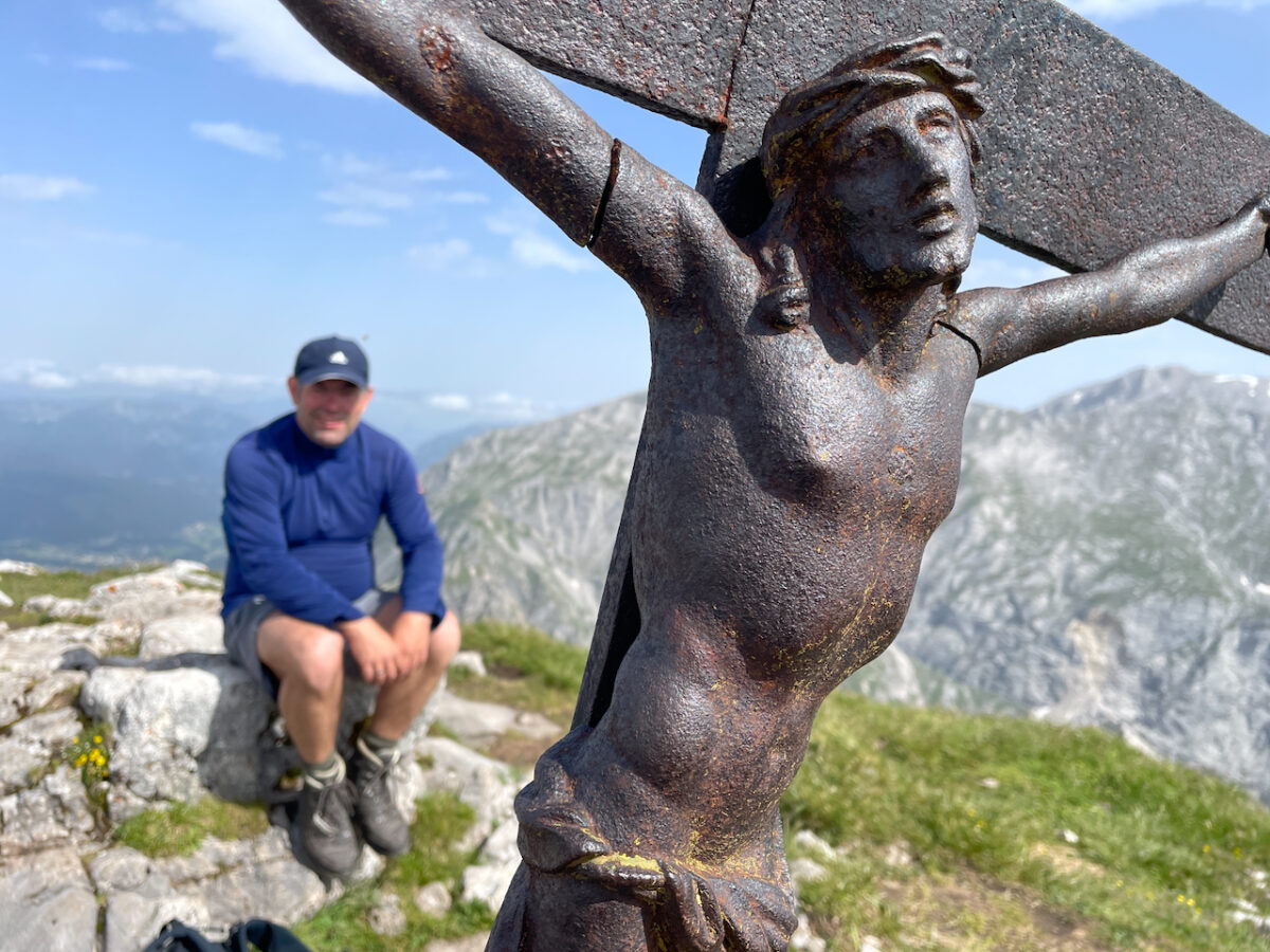 Am nächsten Morgen wartet gleich der erste Gipfel. Durch Latschenfelder steigen wir zum Schneibstein auf. Der kleine Herrgott am Kreuz schaut auf ein Panorama, das kurz innehalten lässt: der Hohe Göll im Rücken, das Tennengebirge im Osten, das Steinerne Meer im Süden, weit unten der Königssee.