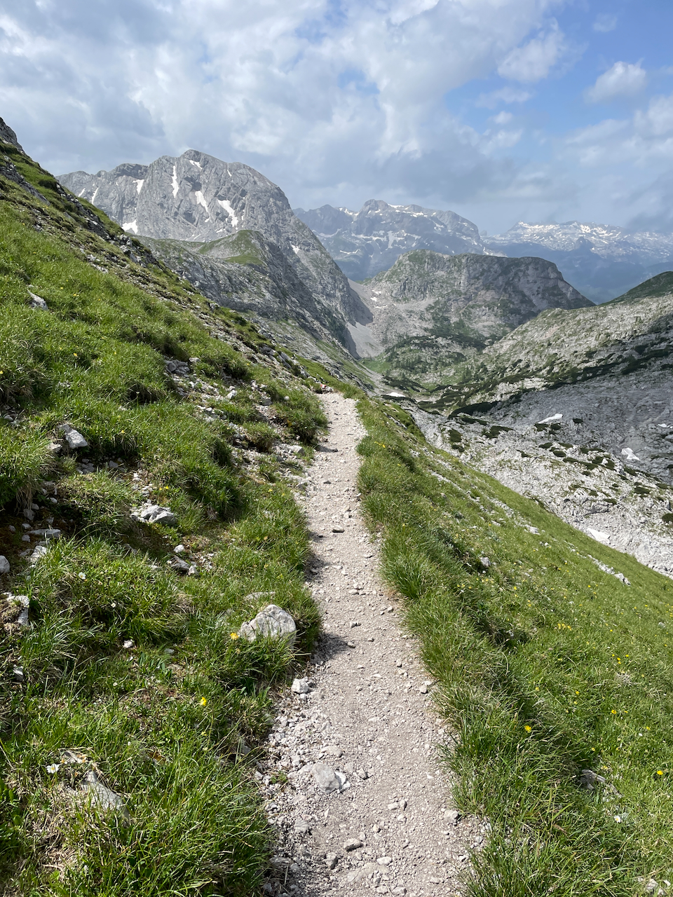 Der Weg führt weiter über karge Karstflächen. Steinmänner weisen durch eine Landschaft aus Kalk, Rinnen und Schneefeldern.