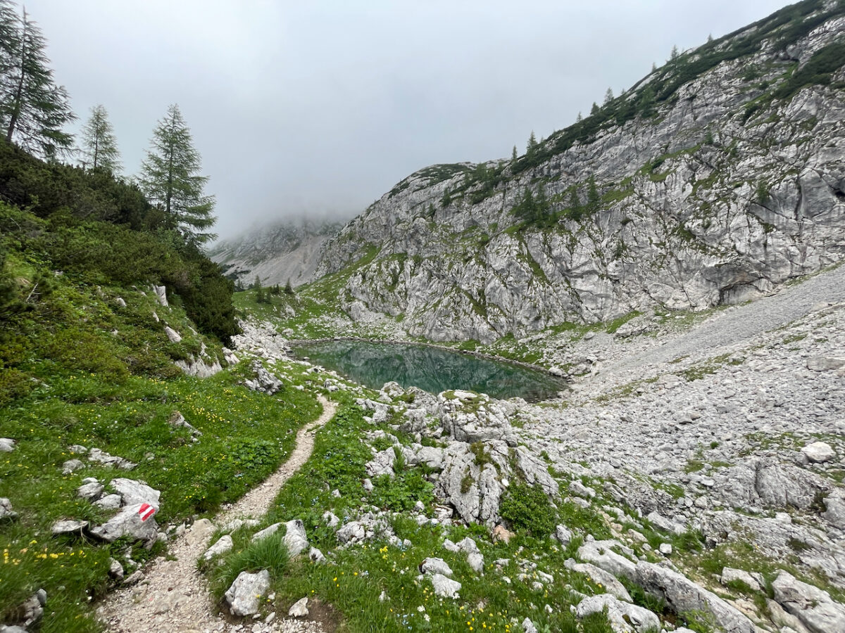 Dann liegt plötzlich der Seeleinsee vor uns. Ein kleiner Bergsee, eingeklemmt zwischen den Felsen des Hohen Gölls. Die Pause fällt länger aus – das Wasser ist so kalt, dass man die Füße kaum länger als ein paar Sekunden hineinhalten kann. Trotzdem können wir uns ein kurzes Bad nicht verkneifen,