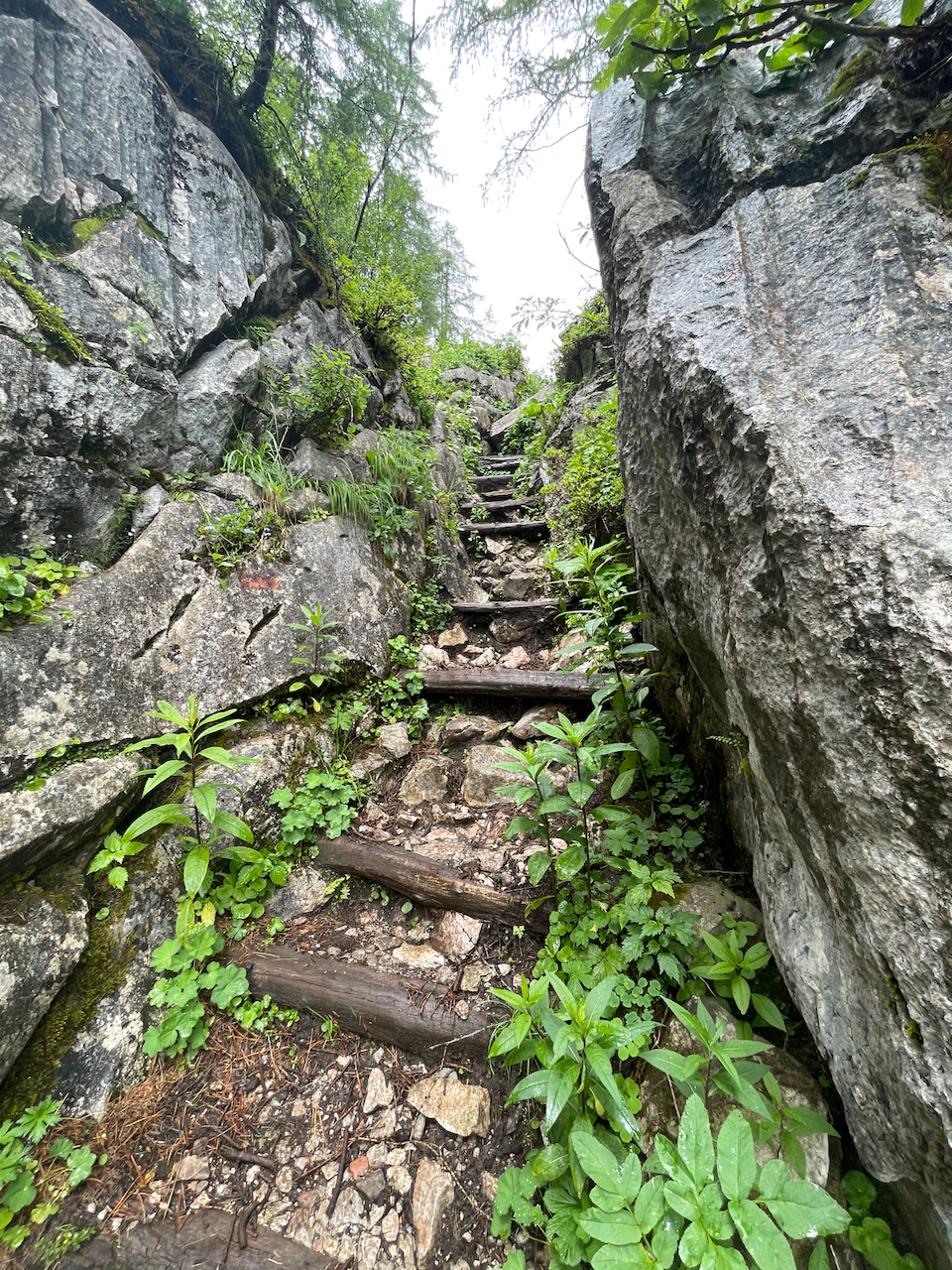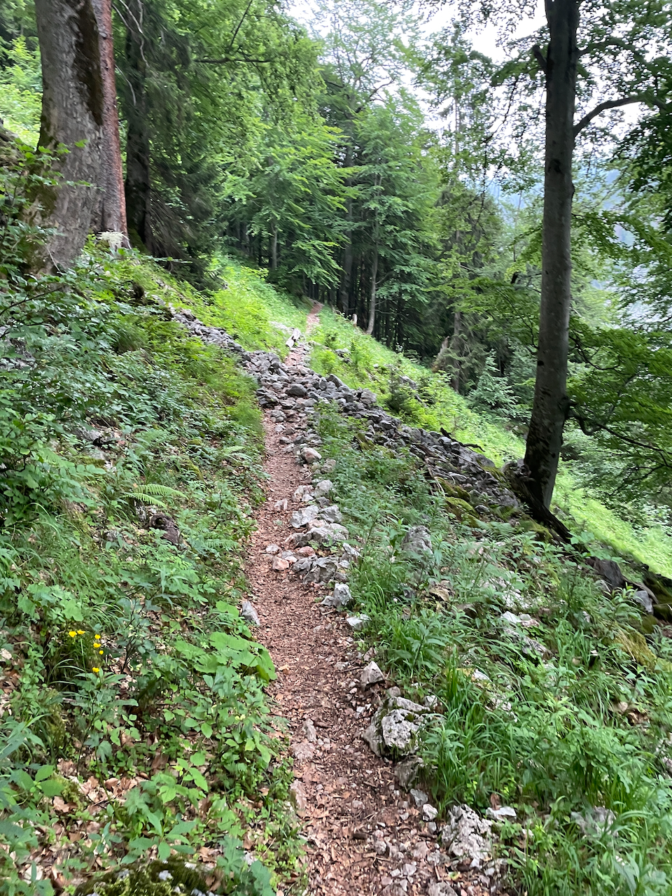 Also weiter, vorbei am Schwarzensee und später am Grünsee. Der Weg zieht langsam höher, bis wir die Wegkreuzung oberhalb der Saugasse erreichen. Vorher wird es noch einmal steil, der Rucksack drückt, und trotz Regen kommen wir ordentlich ins Schwitzen.