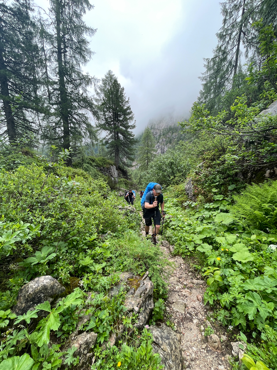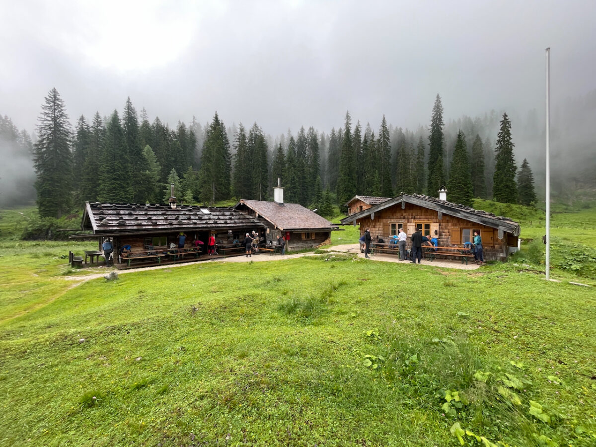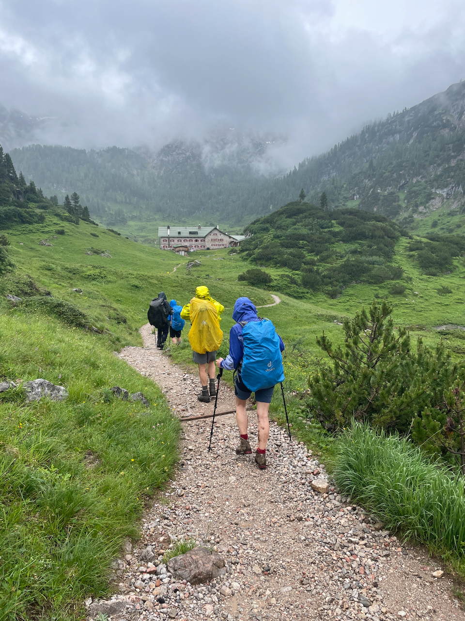 Am letzten Morgen regnet es noch immer. Vom Kärlingerhaus geht es zunächst leicht bergauf, bevor der lange Abstieg beginnt.