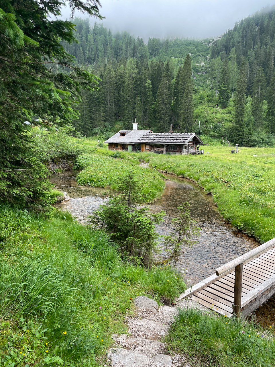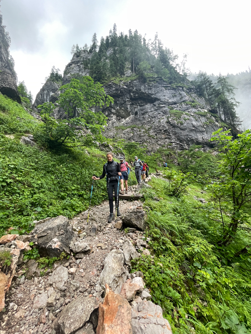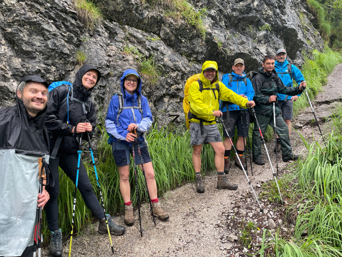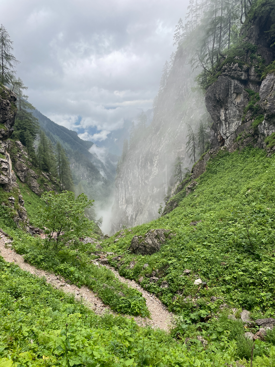 Am letzten Morgen regnet es noch immer. Vom Kärlingerhaus geht es zunächst leicht bergauf, bevor der lange Abstieg beginnt.