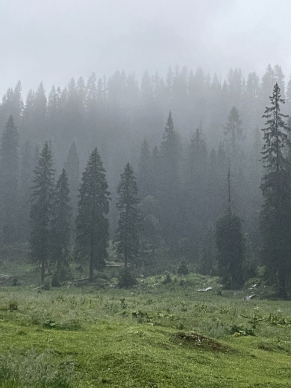 Als wir am späten Nachmittag die Wasseralm erreichen, ziehen Wolken auf. Kurz darauf beginnt es zu regnen, Nebelschwaden ziehen über die Wiesen. Drinnen wartet eine heiße Suppe – draußen grasen seelenruhig Rehe vor den Hütten.