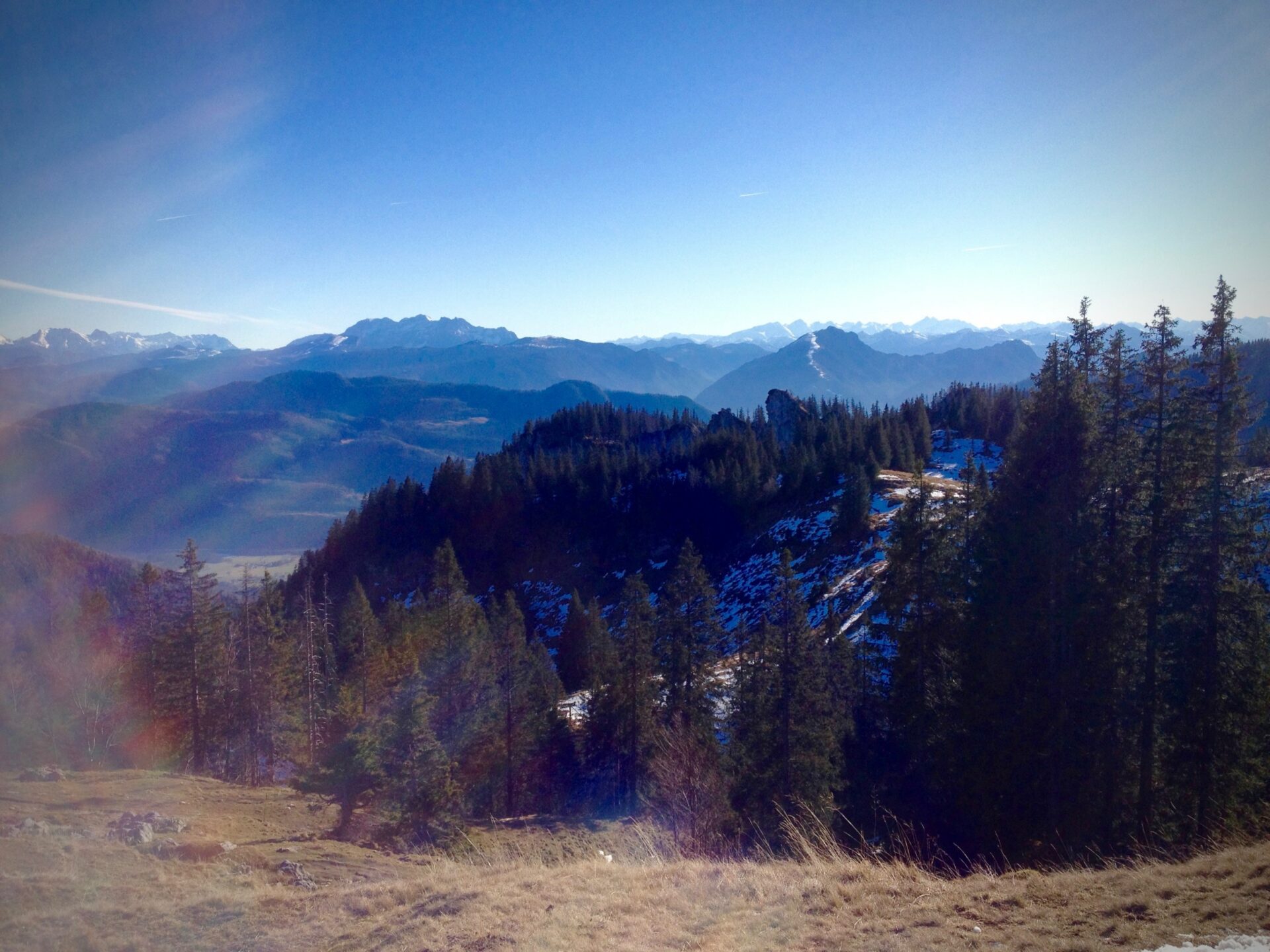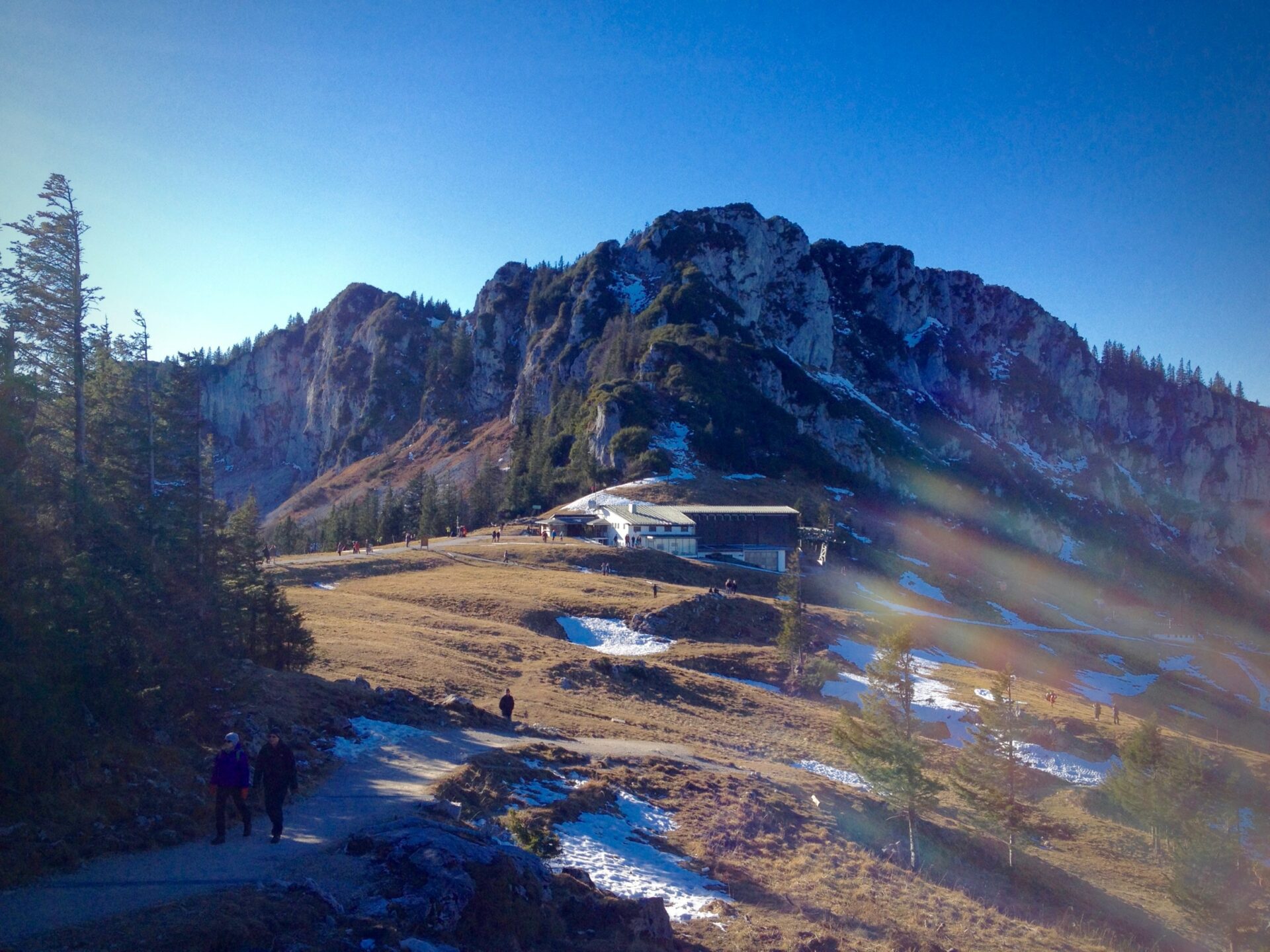 Normalerweise ist zu der Zeit, zu der wir an der Kampenwandbahn aufschlagen Skibetrieb. Zwischen Weihnachten und Sylvester ist 2015 aber eher Wandern als Skifahren angesagt. Und so lösen wir am frühen Nachmittag das Familien-Ticket für die Fahrt nach oben, steigen in die schönen alten Gondeln und gleiten leise und ohne Anstrengung hinauf zur Bergstation. Den Gedanken hatten bei dem guten Wetter heute wohl mehr Leute und so ist es zwischen Bergstation und Sonnenalm ziemlich voll. Kein Wunder, zur Sonnenalm schafft man es auch in FlipFlops.
