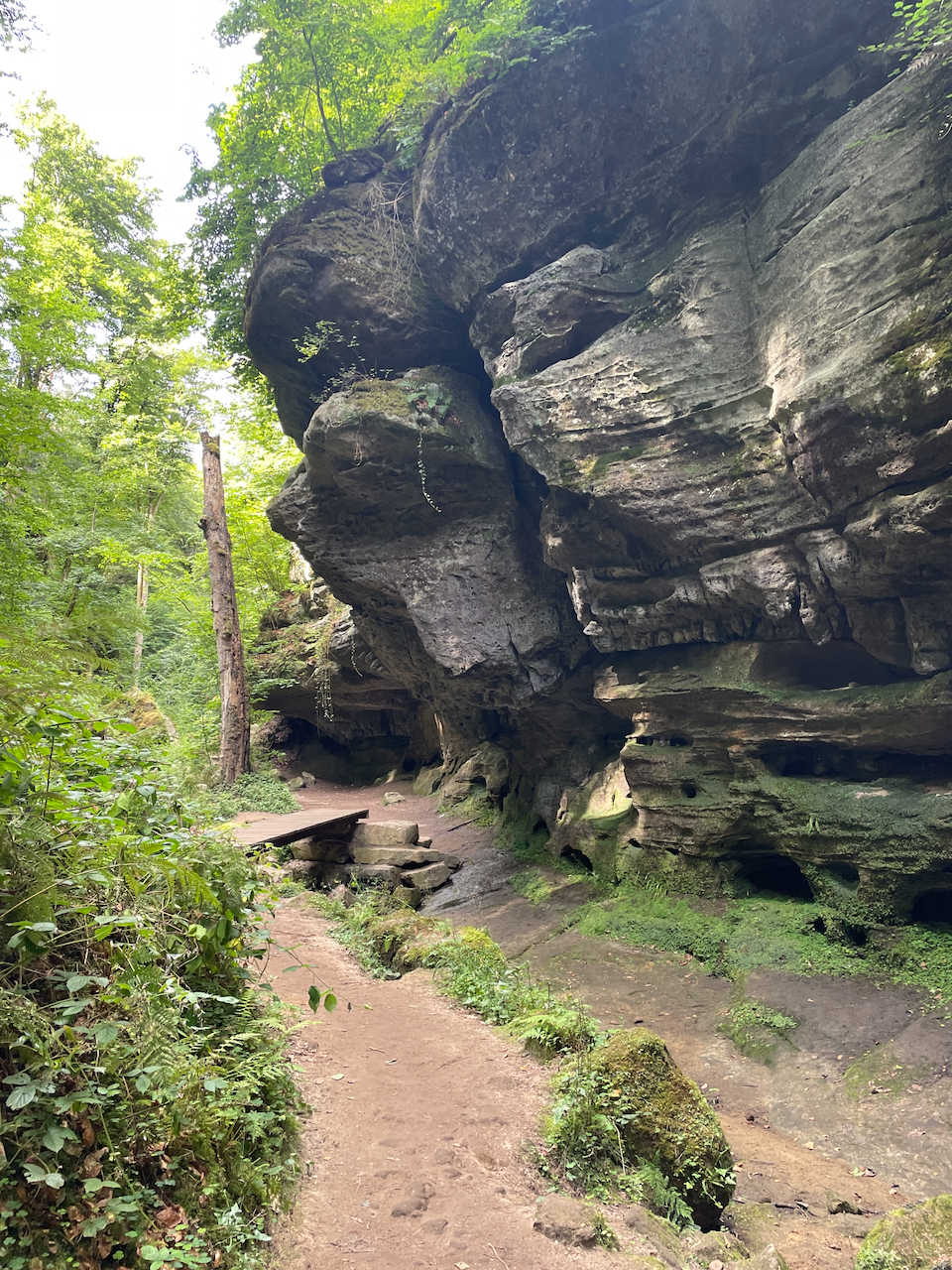 Wer sich Zeit nimmt, entdeckt in der Schlucht immer wieder kleine Details: Wasser, das über den Fels rinnt, bizarre Strukturen im Gestein und das wechselnde Spiel von Licht und Schatten. Gerade diese Mischung aus Enge, Ruhe und Ursprünglichkeit macht die Wolfsschlucht zu einem der eindrucksvollsten Orte auf dem gesamten Mullerthal Trail.