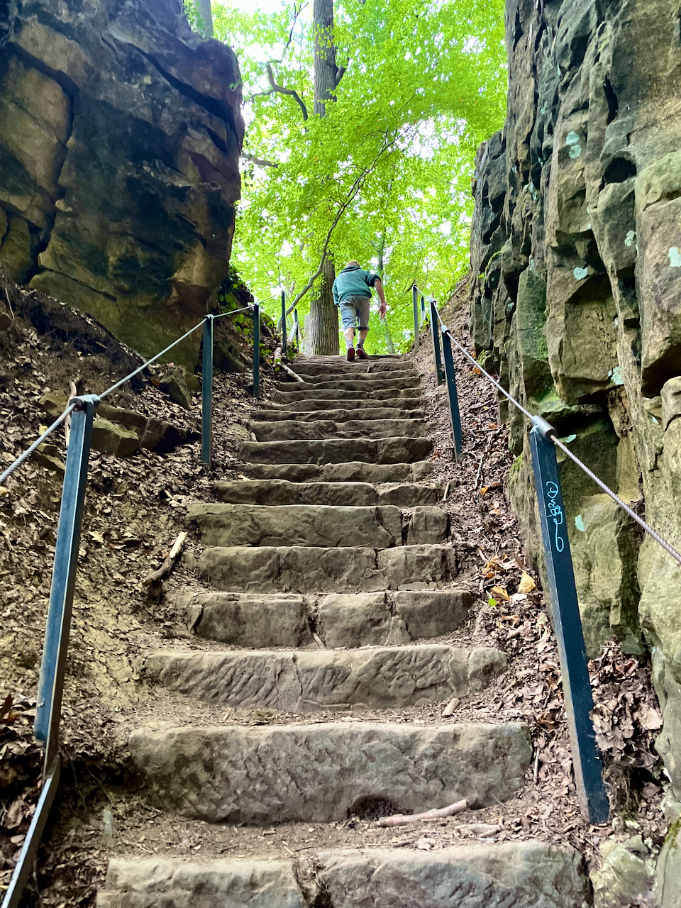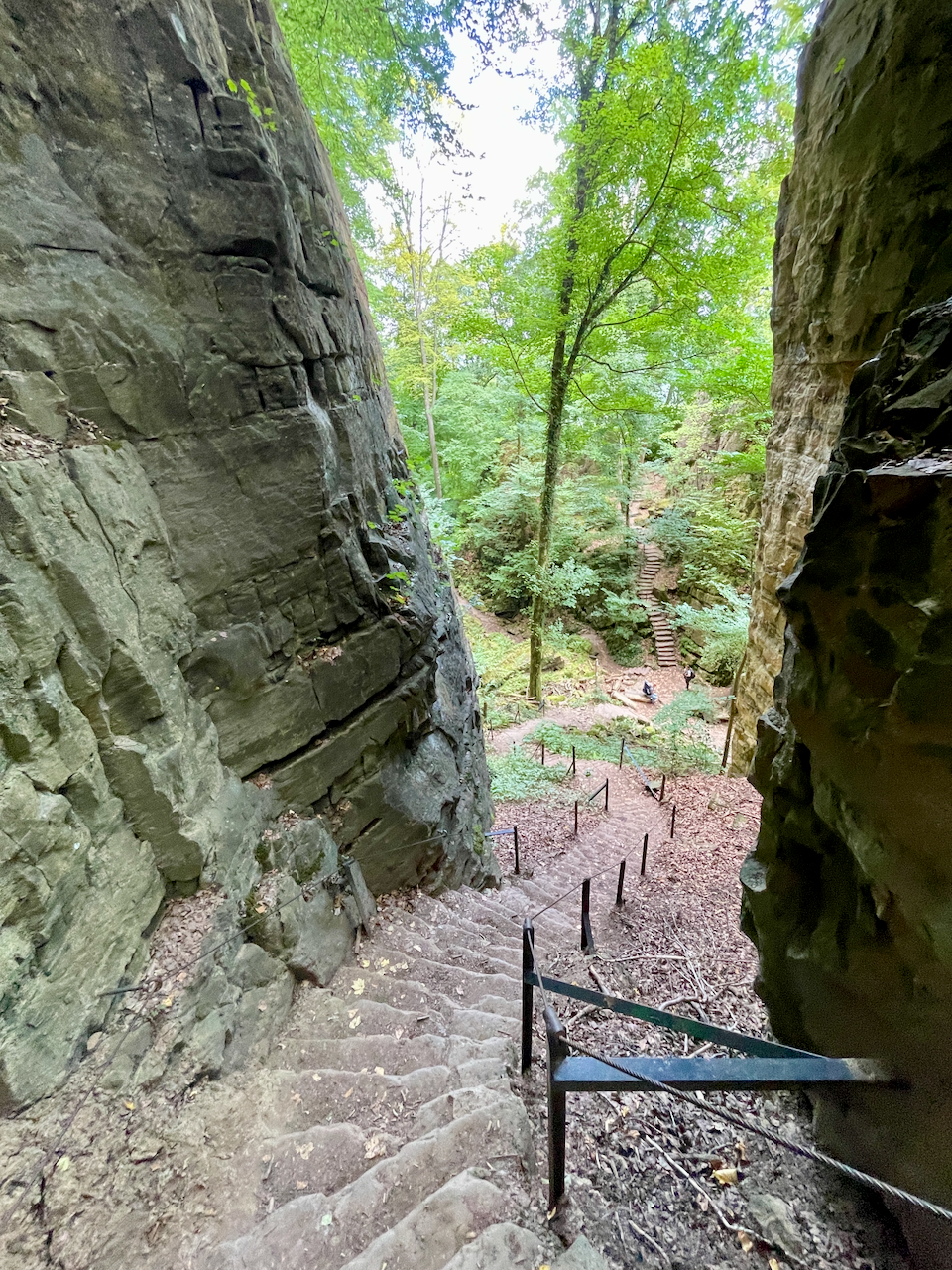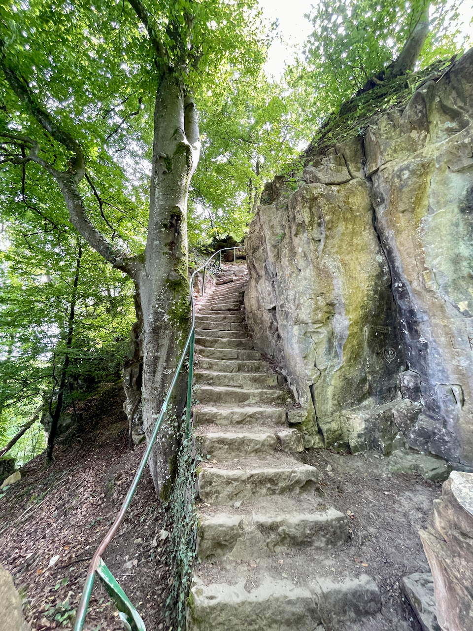 Der eindrucksvollste Abschnitt ist die Wolfsschlucht. Hier zwängt sich der Pfad durch eine enge Felsspalte, teilweise so schmal, dass man automatisch langsamer wird. Es geht über Treppen, durch Felsgänge, immer wieder bergauf – kühl, schattig und ein bisschen abenteuerlich.