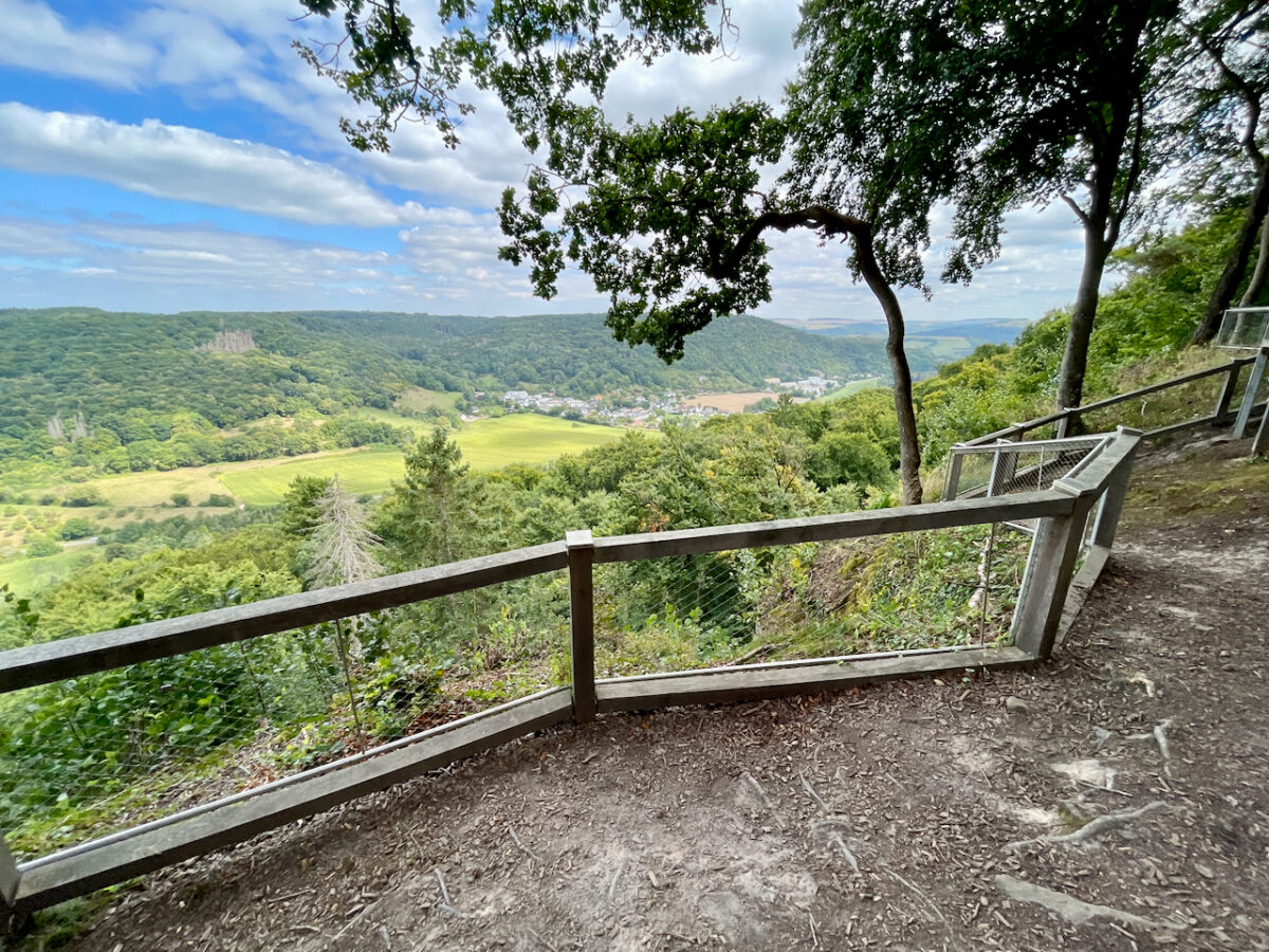 Oberhalb der Schlucht lohnt sich eine Pause: Vom Aussichtspunkt blickt man hinunter auf Echternach und erkennt bereits die markante Basilika St. Willibrord.