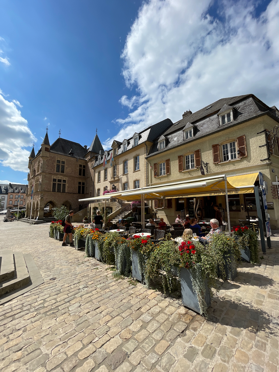 Der Abstieg führt direkt hinein nach Echternach, Luxemburgs ältester Stadt. Nach Stunden im Fels wirkt der Ort fast mediterran: ein lebendiger Marktplatz, Cafés, Restaurants, kleine Geschäfte.