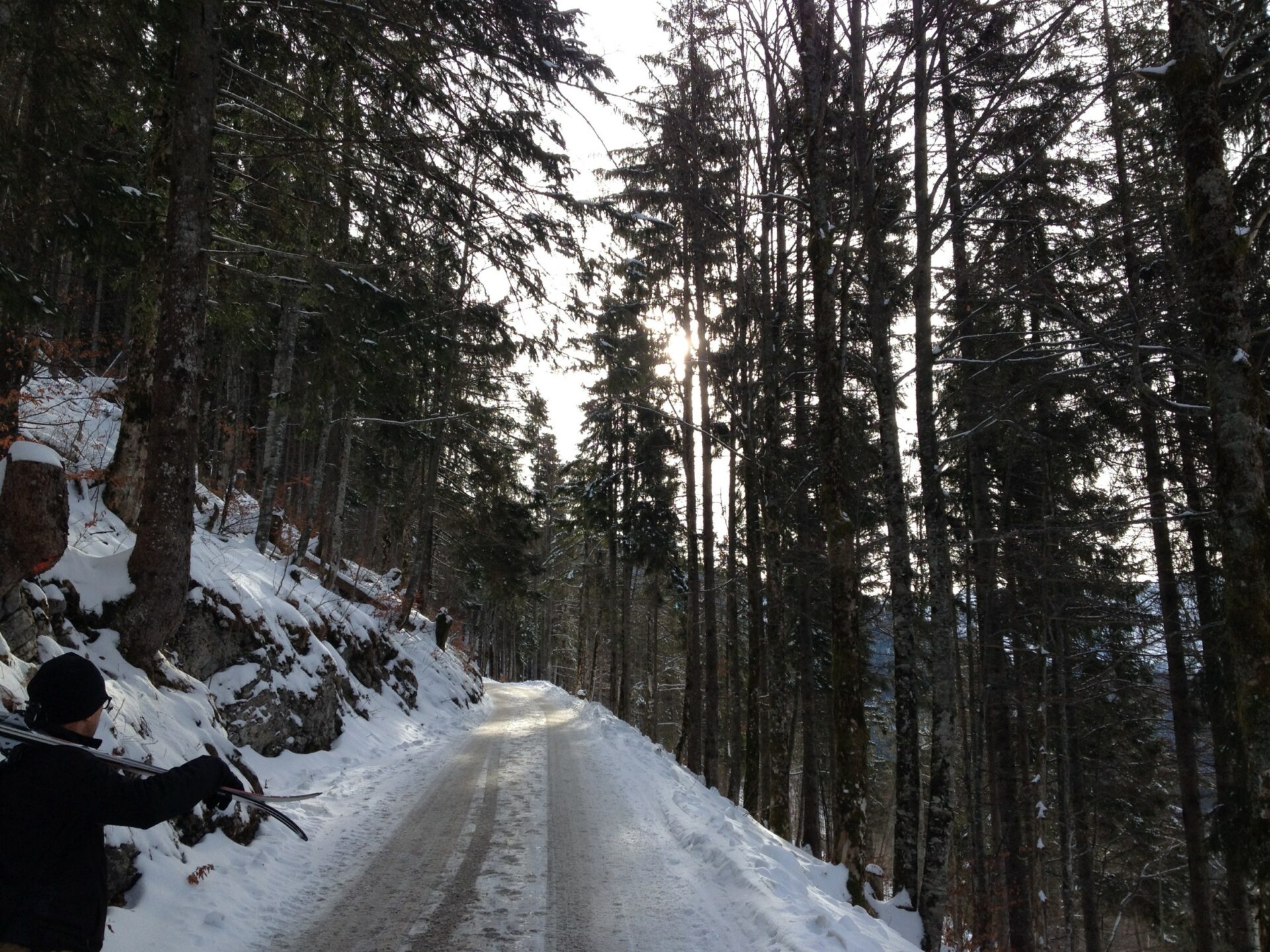 Nach der Bergwachthütte endet rechts die Rodelbahn, der wir jetzt für die nächsten zwei Stunden bergauf folgen. Es geht stets bergauf und zwischen dem Bäumen öffnet sich immer wieder der Blick in Richtung Schinder, Karwendel und hinüber ins Kaisergebirge und zum Alpenhauptkamm.