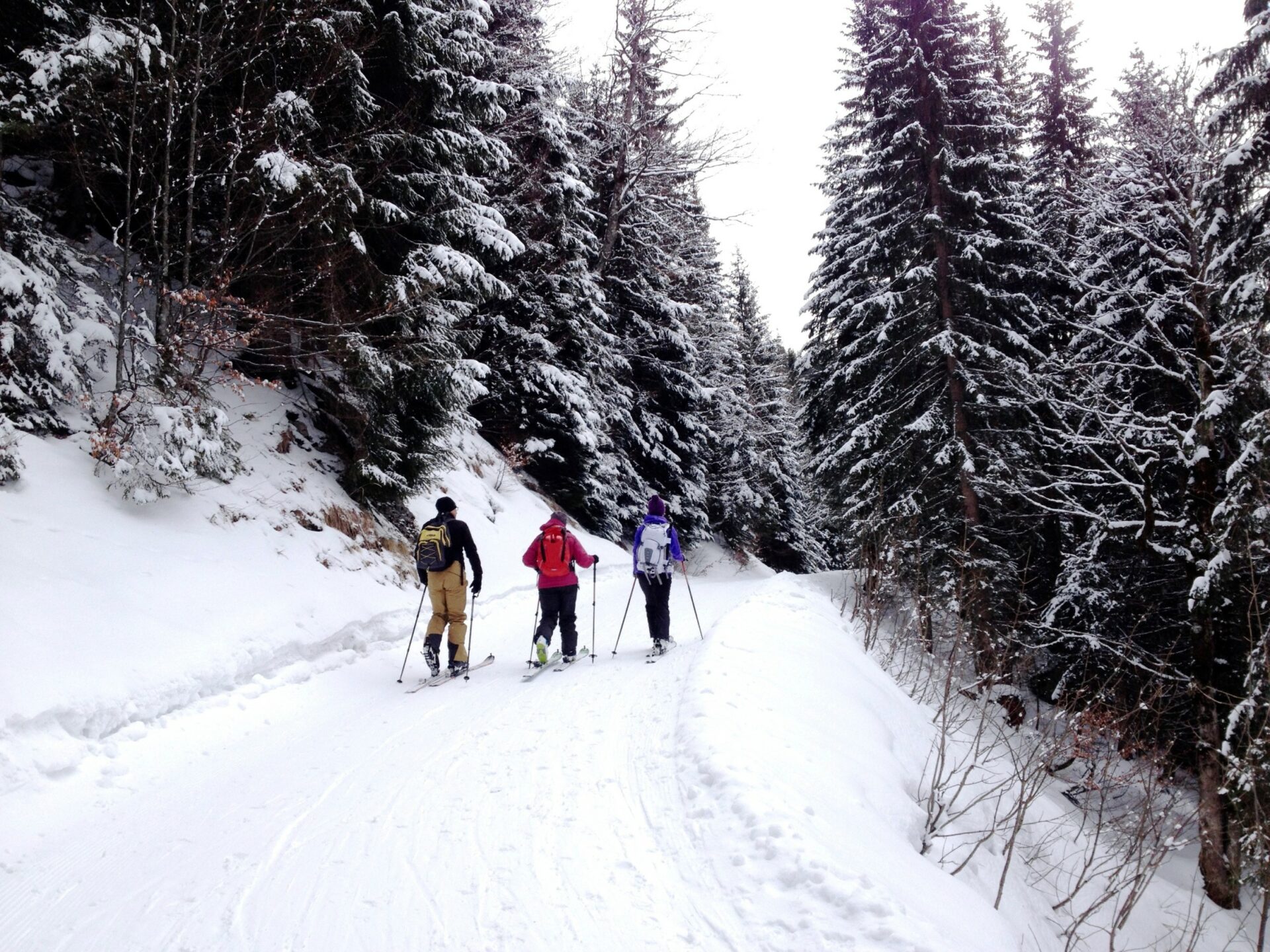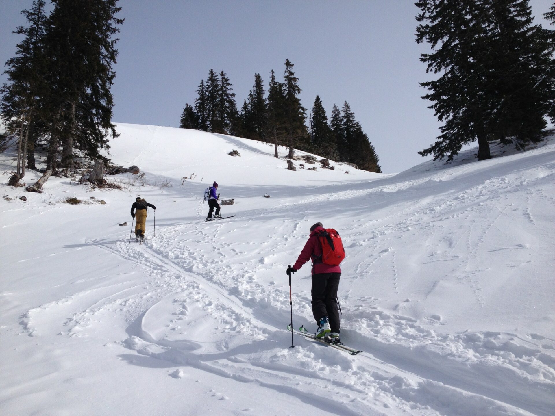 Vorher machen wir aber noch ein paar Suchübungen mit dem Lawinenpieps im flachen Gelände. Der Pieps wird versteckt und das Suchszenario mehrmals durchgespielt, der Umgang mit Pieps, Schaufel und Sonde geübt. Denn nach der Mittagspause auf der Hütte geht’s endlich ins freie Gelände.