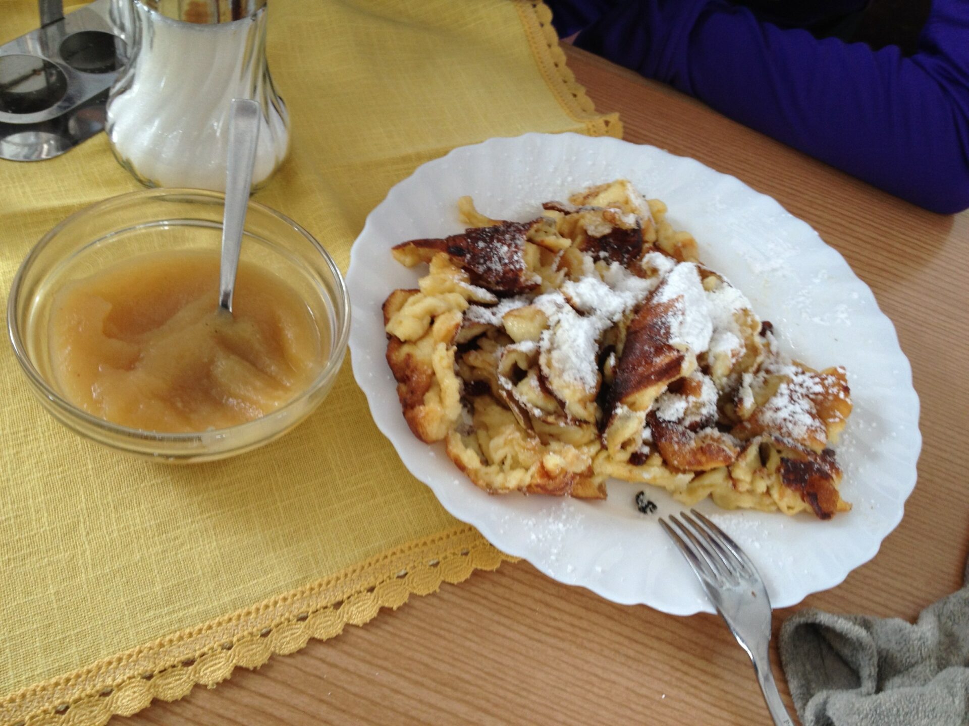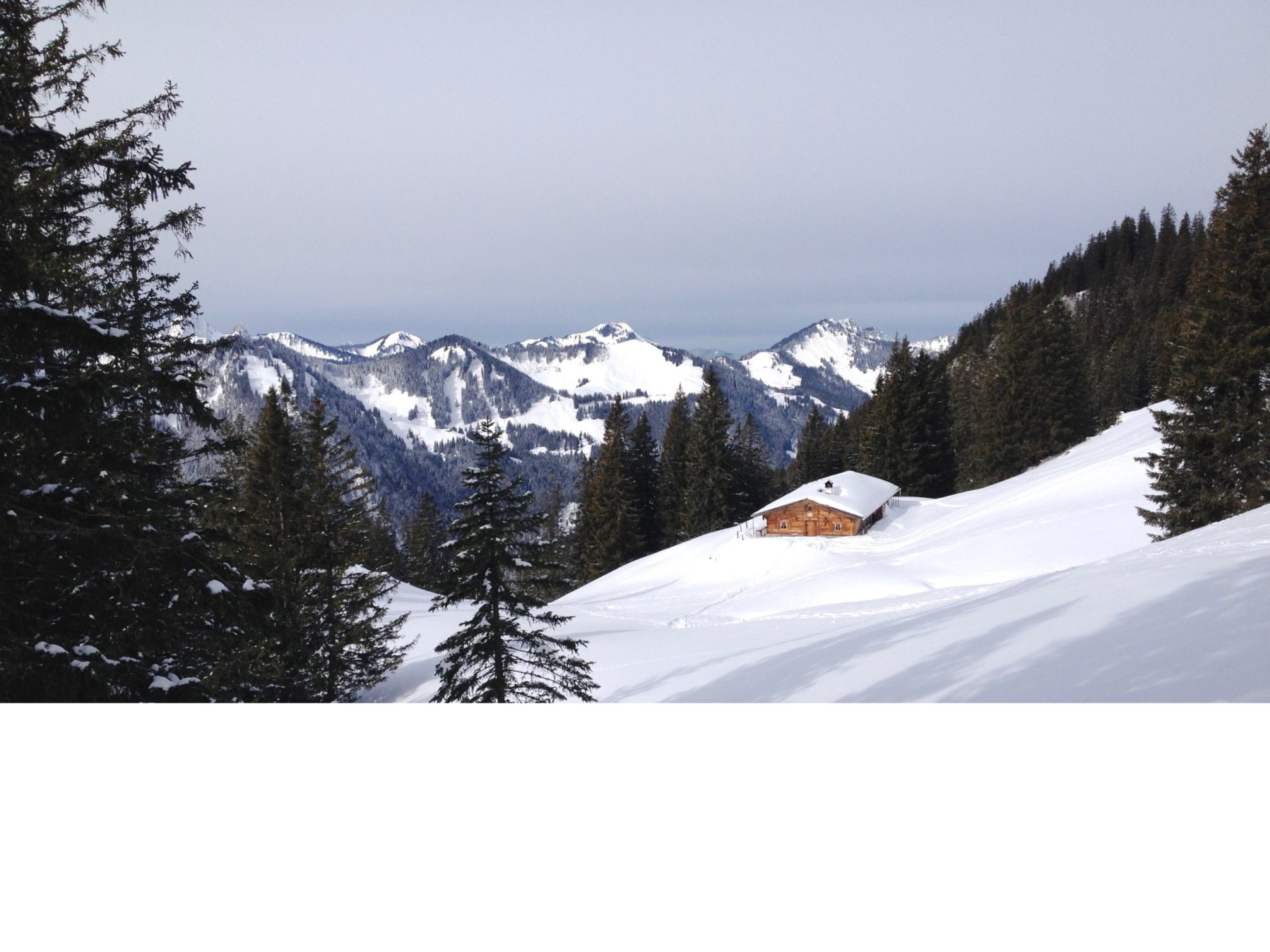 Wir haben die Rodelbahn fast geschafft. Meist auf dem direkten Weg, an zwei oder drei Stellen auch durch den Wald abkürzend. Ideales Gelände zum Einstieg in das Gehen mit den Tourenski. Nun blicken hinüber zum Rotwandhaus auf seinem Aussichtplateau unterhalb der Rotwand. Statt auf den Gipfel, den doch einige Skitourengeher anpeilen, geht es für uns direkt hinüber zum Rotwandhaus für eine Runde Kaiserschmarrn (die wirkliche Spezialität des Hauses ;-)