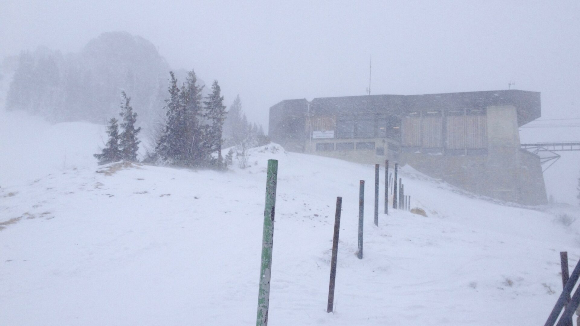 Wir ziehen derweil unsere Spur weiter hinüber zum Sattel unterhalb der Bergbahnstation, wo wir in Orkanböen, Schnee und Schneeregen abfellen und die Abfahrt auf der ehemaligen Skipiste den Lochgraben entlang bei guten Verhältnissen abfahren. Früher konnte man das Gleitstück in der unteren Hälfte der Abfahrt mit einem kleinen Lift abkürzen, aber der wurde mit dem Rest des Skigebiets dieses Jahr abgeschalten. Also weiter im Skatingschritt bis zum letzten steilen Stück hinunter zum Parkplatz.