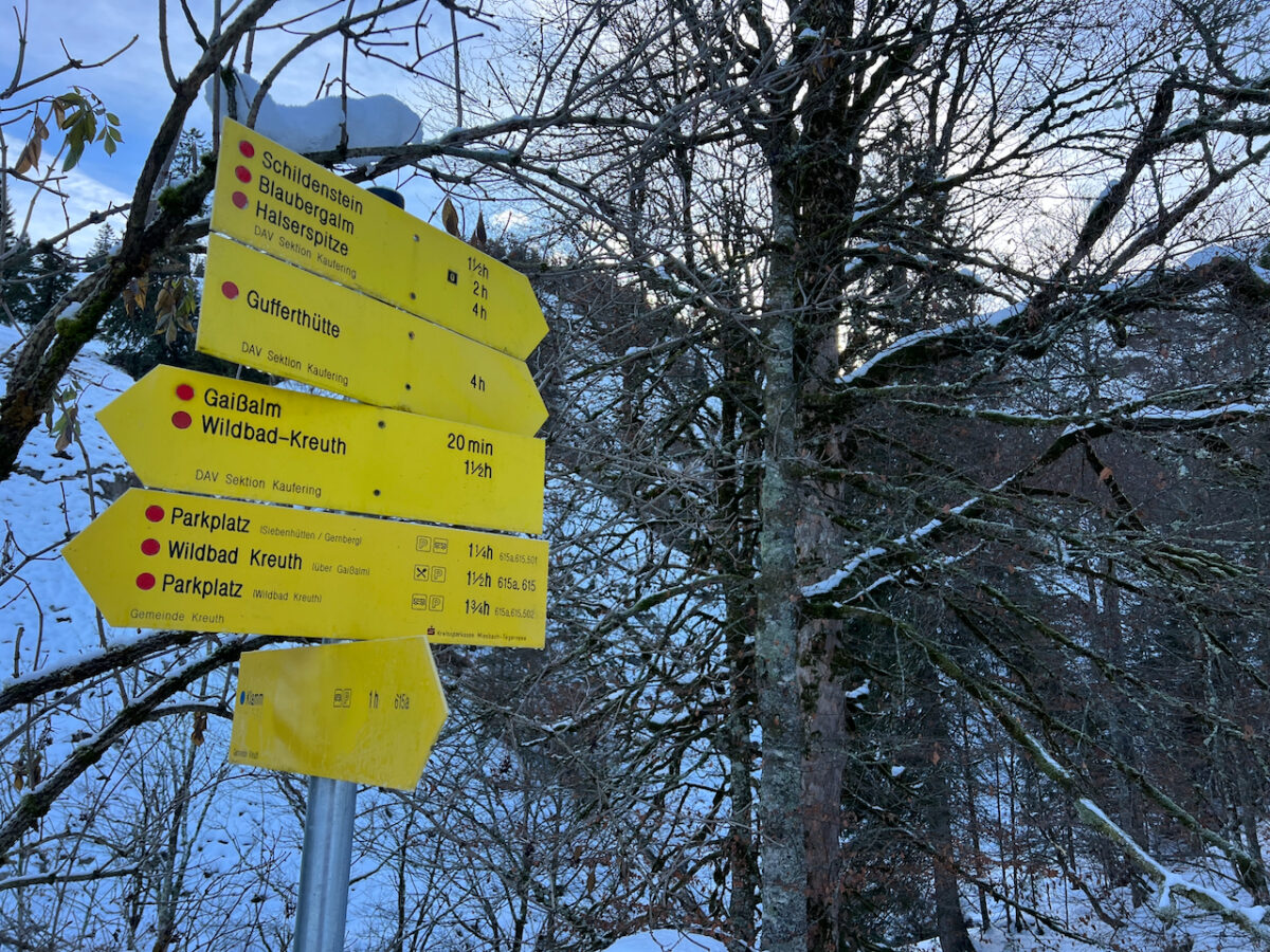 Der Parkplatz Klamm in Kreuth ist im Sommer normalerweise ein Ort, an dem man früh da sein muss, wenn man überhaupt noch irgendwo sein Auto zwischen die anderen quetschen will. Jetzt, im Winter wenn der Schnee für die Loipen im Tal fehlt, sieht das Ganze allerdings völlig anders aus: Eisplatte statt Parkchaos. Und wir sind das einzige Auto weit und breit. Das Thermometer zeigt –5 Grad.