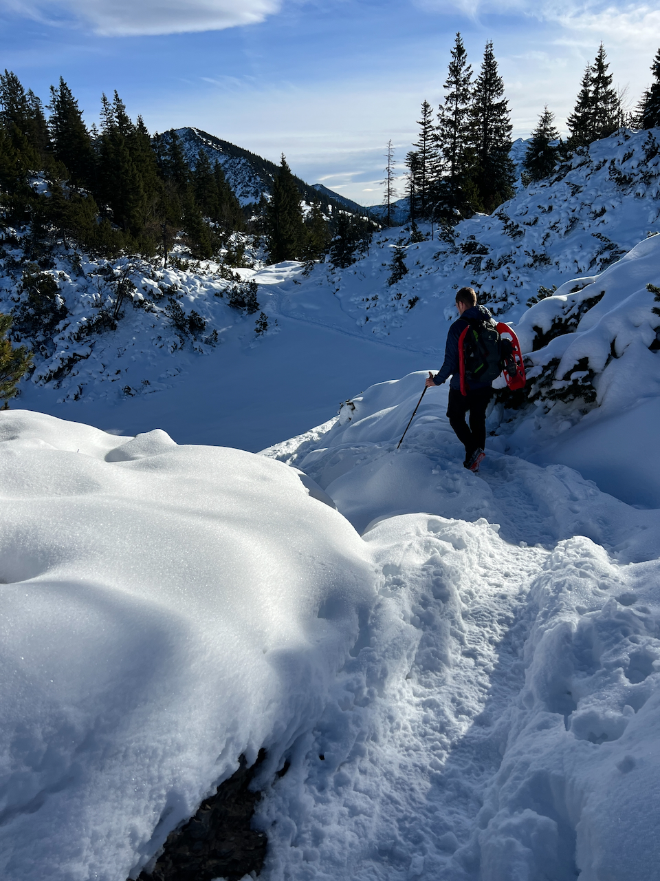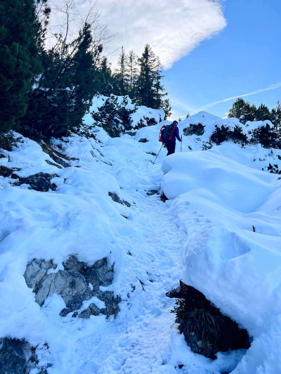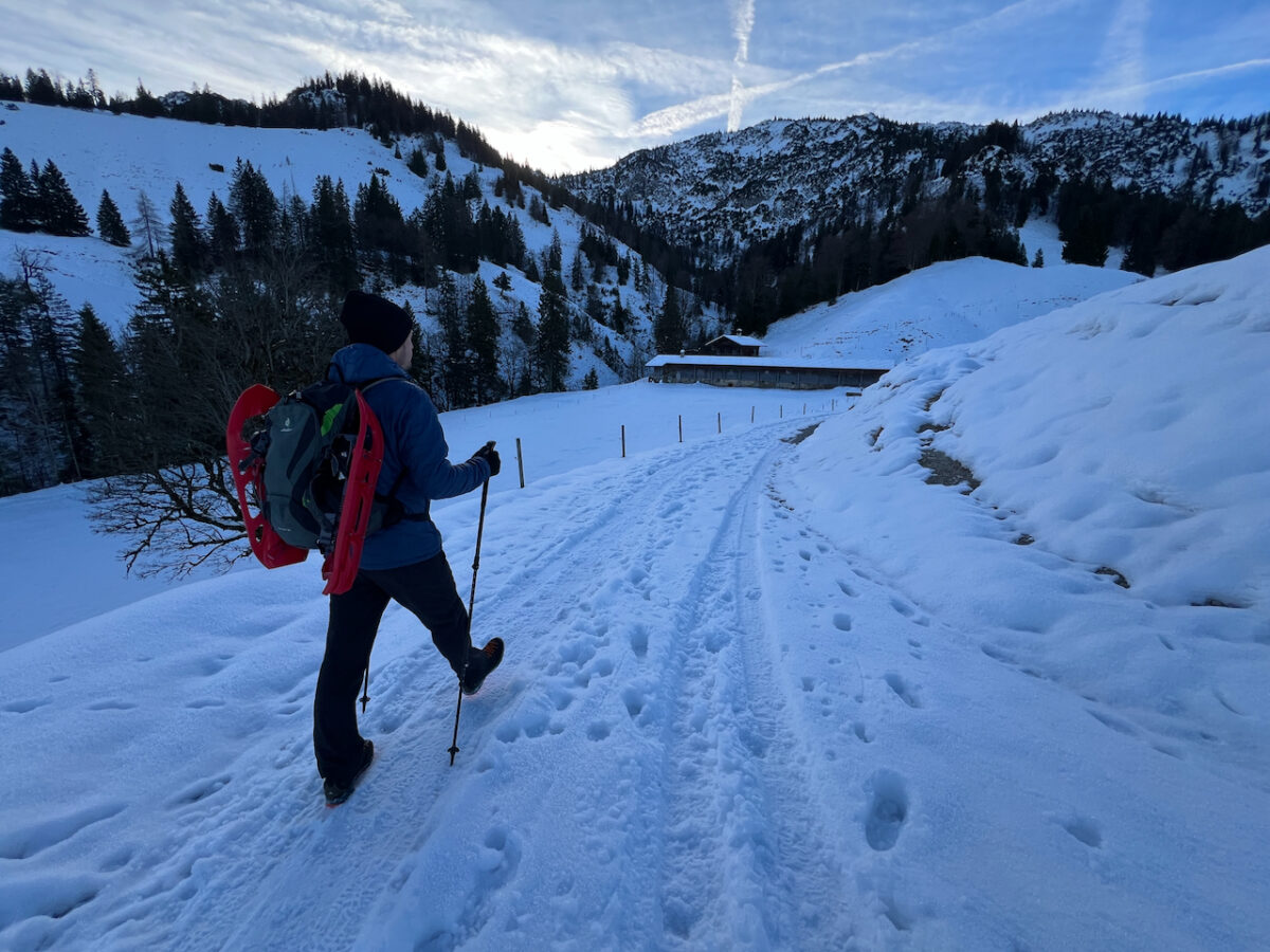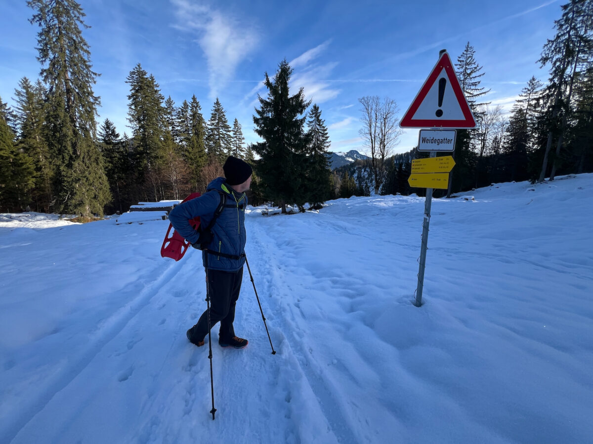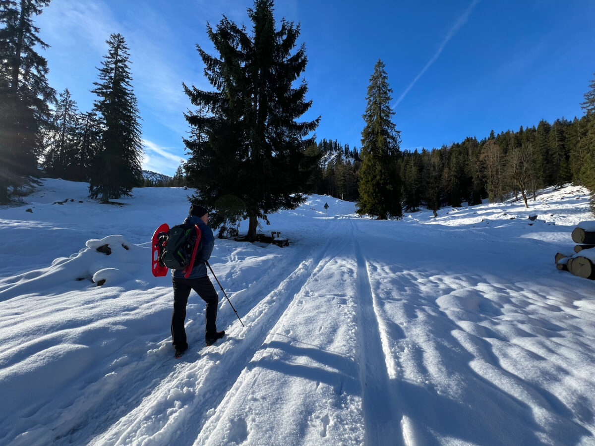 Auch unsere Schneeschuhe bleiben heute reine Dekoration am Rucksack. Wir haben sie zwar brav mitgenommen – gebraucht werden sie aber kein einziges Mal. Die Spur ist durchgehend gut ausgetreten, der letzte Schneefall liegt schon ein paar Tage zurück.