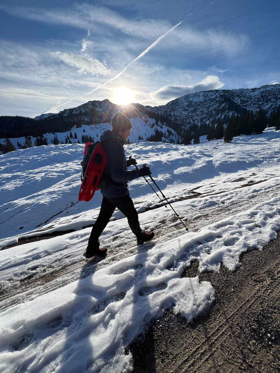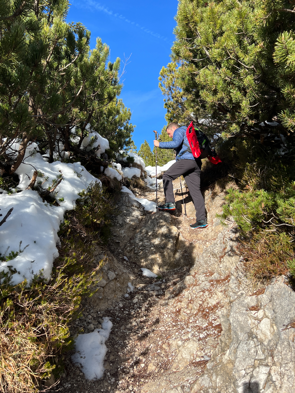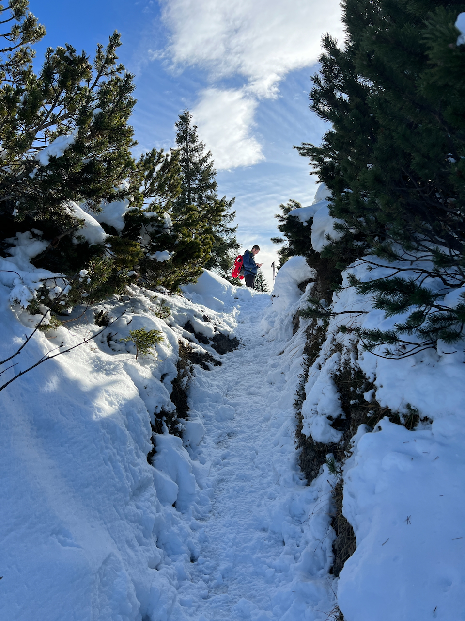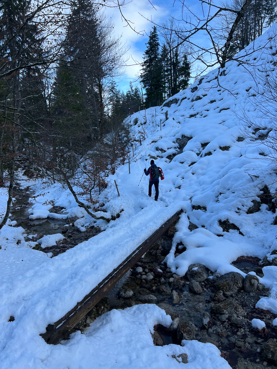 Auch unsere Schneeschuhe bleiben heute reine Dekoration am Rucksack. Wir haben sie zwar brav mitgenommen – gebraucht werden sie aber kein einziges Mal. Die Spur ist durchgehend gut ausgetreten, der letzte Schneefall liegt schon ein paar Tage zurück.