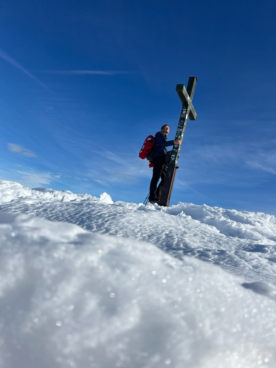 Wir bleiben eine ganze Weile oben sitzen, obwohl es eigentlich ziemlich kalt ist. Aber manchmal gibt es Tage, da passt einfach alles: Schnee, Sonne, Aussicht und erstaunlich wenig Menschen. Der ganze Stress bleibt irgendwo unten unter der Nebeldecke hängen. Die Gedanken werden langsamer, die Schritte gemütlicher und der Moment ein bisschen länger. Nicht die schlechteste Art, seinen Tag zu verbringen.