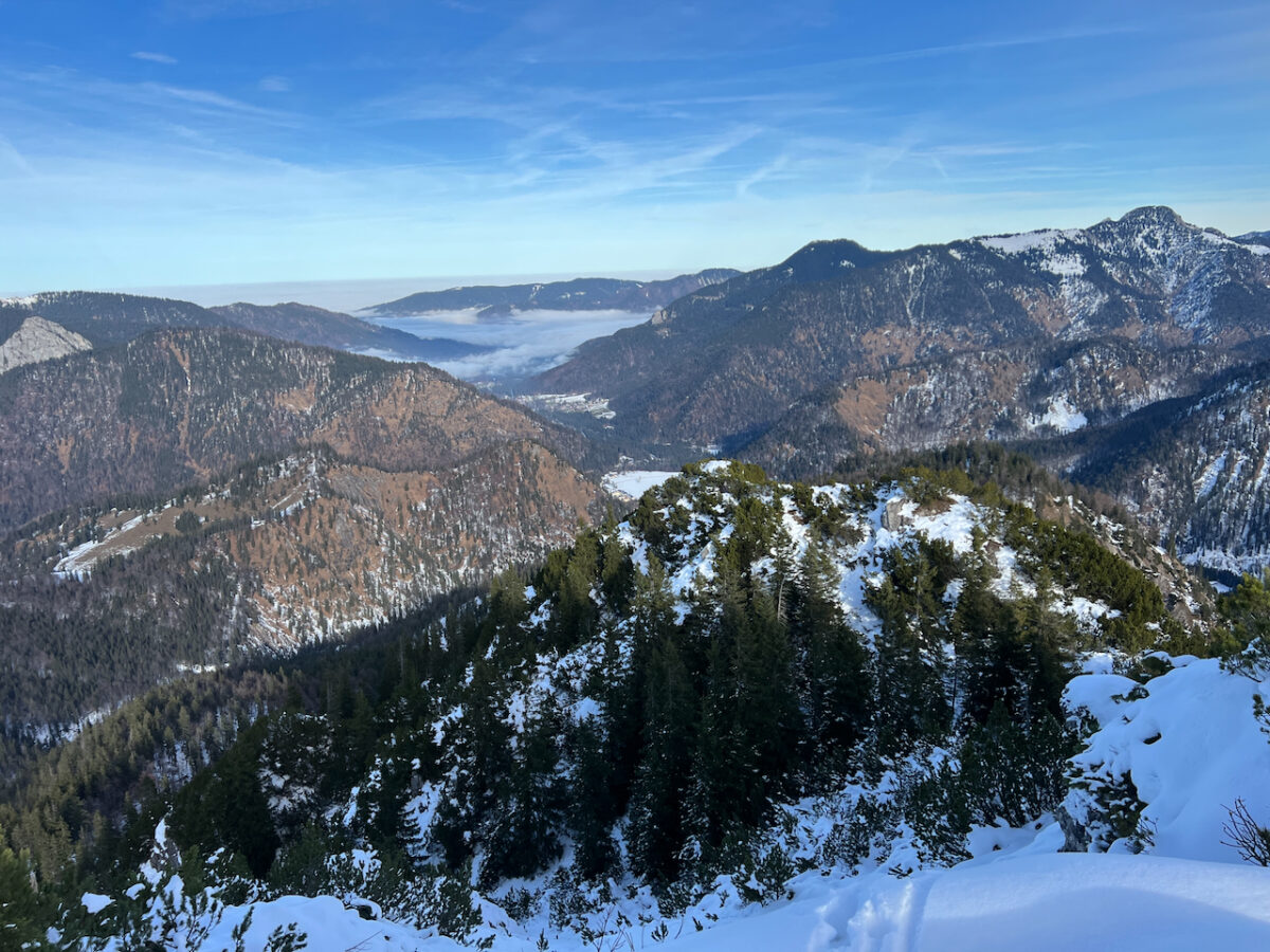 Das Alpenvorland liegt komplett unter einem dichten Nebelteppich. Wir schauen also quasi auf ein riesiges Wattemeer hinaus. Und hinter uns steht das Karwendel – mit seinen unzähligen markanten Gipfeln, wie immer ziemlich beeindruckend. Kurz gesagt: Ein Traumtagerl.